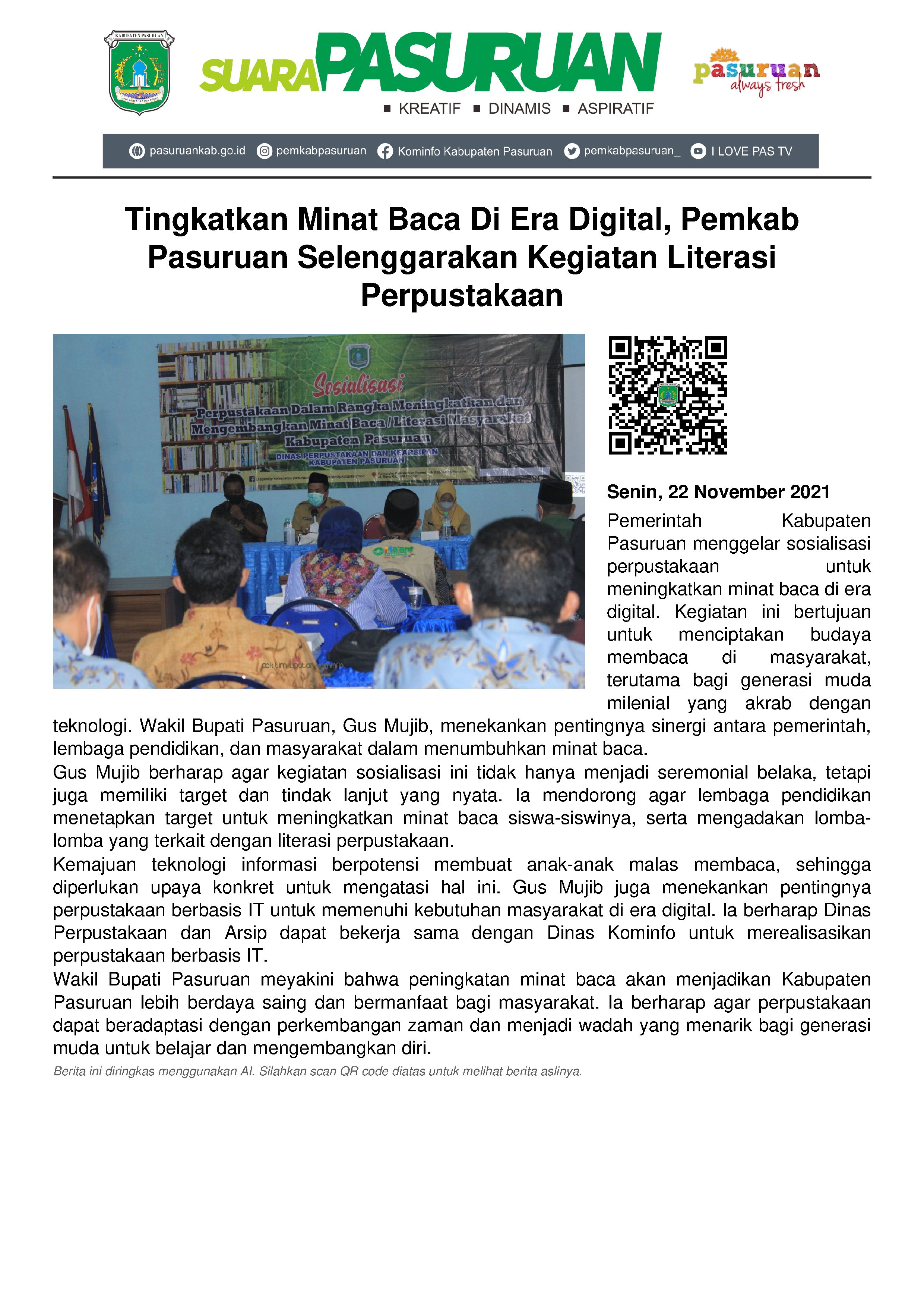 Kegiatan Sosialisasi Perpustakaan Dalam Rangka Meningkatkan dan Mengembangkan Minat Baca/ Literasi yang digelar hari ini, Senin (22/11/2021) diantara upaya Pemerintah Kabupaten Pasuruan untuk menciptakan budaya membaca di masyarakat. Utamanya generasi muda milenial dengan segala dinamikanya di era serba digital.