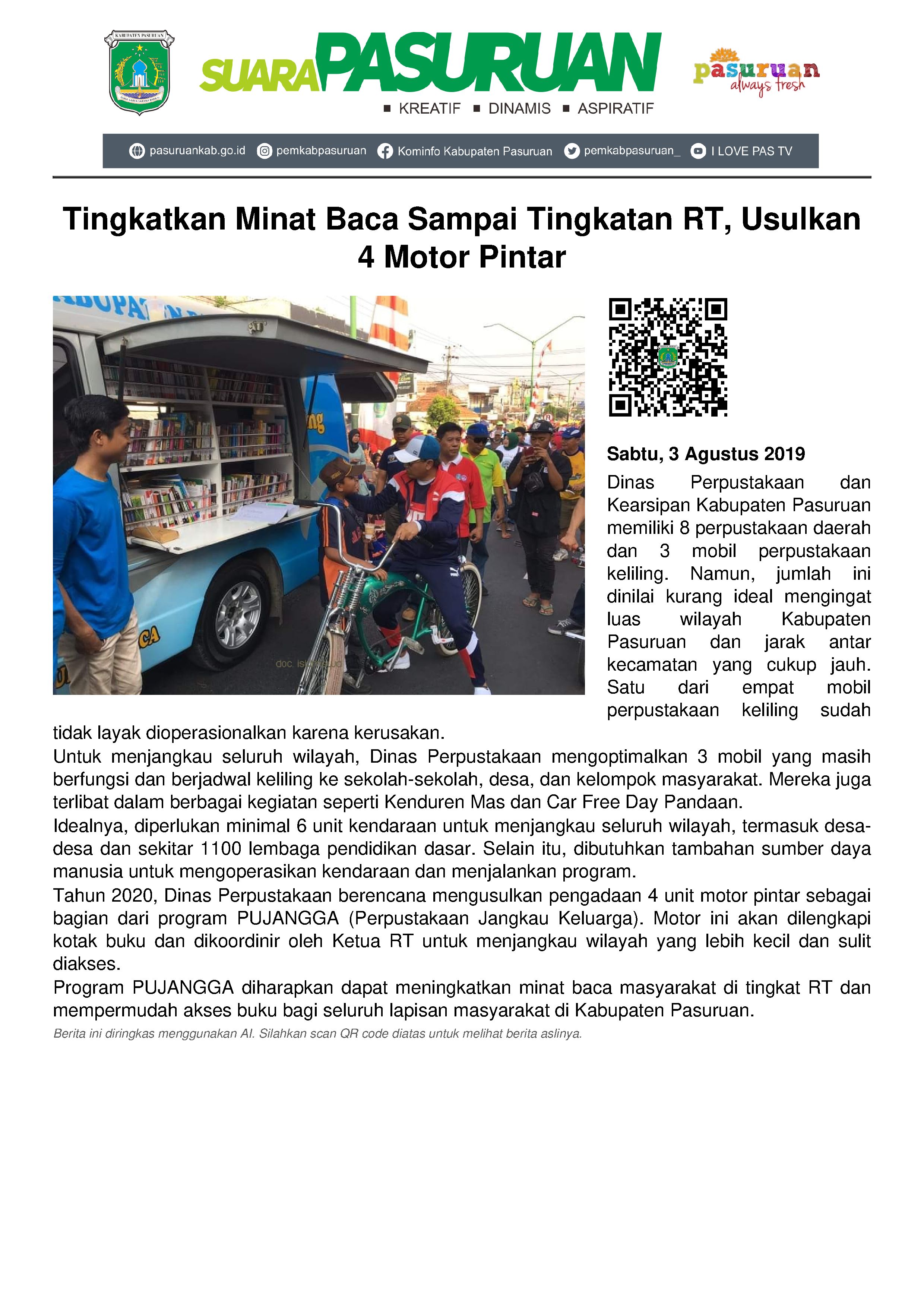 Sementara itu, tahun 2020 mendatang, Dinas Perpustakaan dan Kearsipan akan mengusulkan pengadaan 4 unit motor pintar. Motor tersebut merupakan bagian dari program PUJANGGA (Perpustakaan Jangkau Keluarga) yang tengah dibahas tahun ini. Kata Eben, setiap kendaraan diusulkan dengan anggaran sebesar Rp 30 Juta.