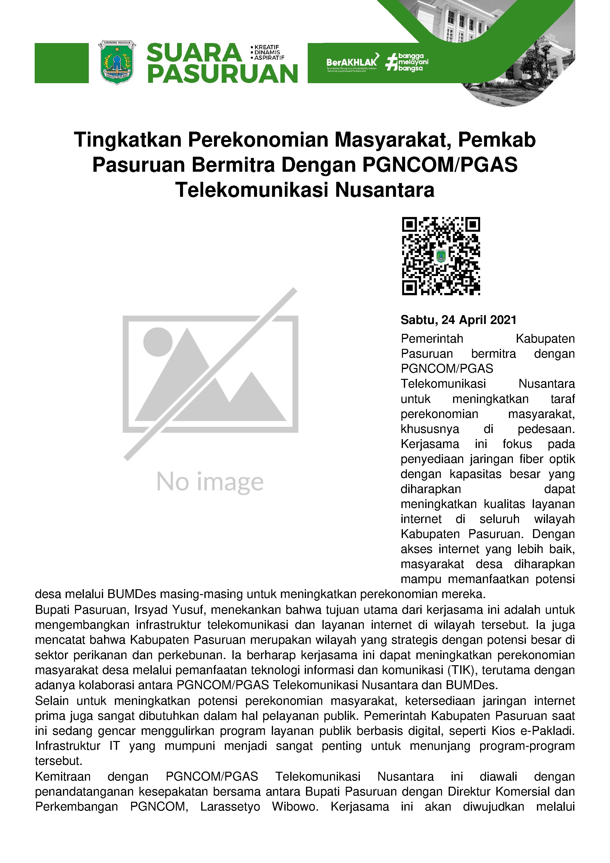 Kemitraan dengan PGNCOM/PGAS Telekomunikasi Nusantara tersebut diawali dengan Penandatanganan Kesepakatan Bersama antara Bupati Pasuruan dengan Direktur Komersial dan Perkembangan PGNCOM, Larassetyo Wibowo pada hari Kamis malam (22/4/2021). Bentuk konkret kerjasamanya melalui pembangunan infrastruktur telekomunikasi dan informatika dengan layanan internet yang bisa dibangun hingga pedesaan.