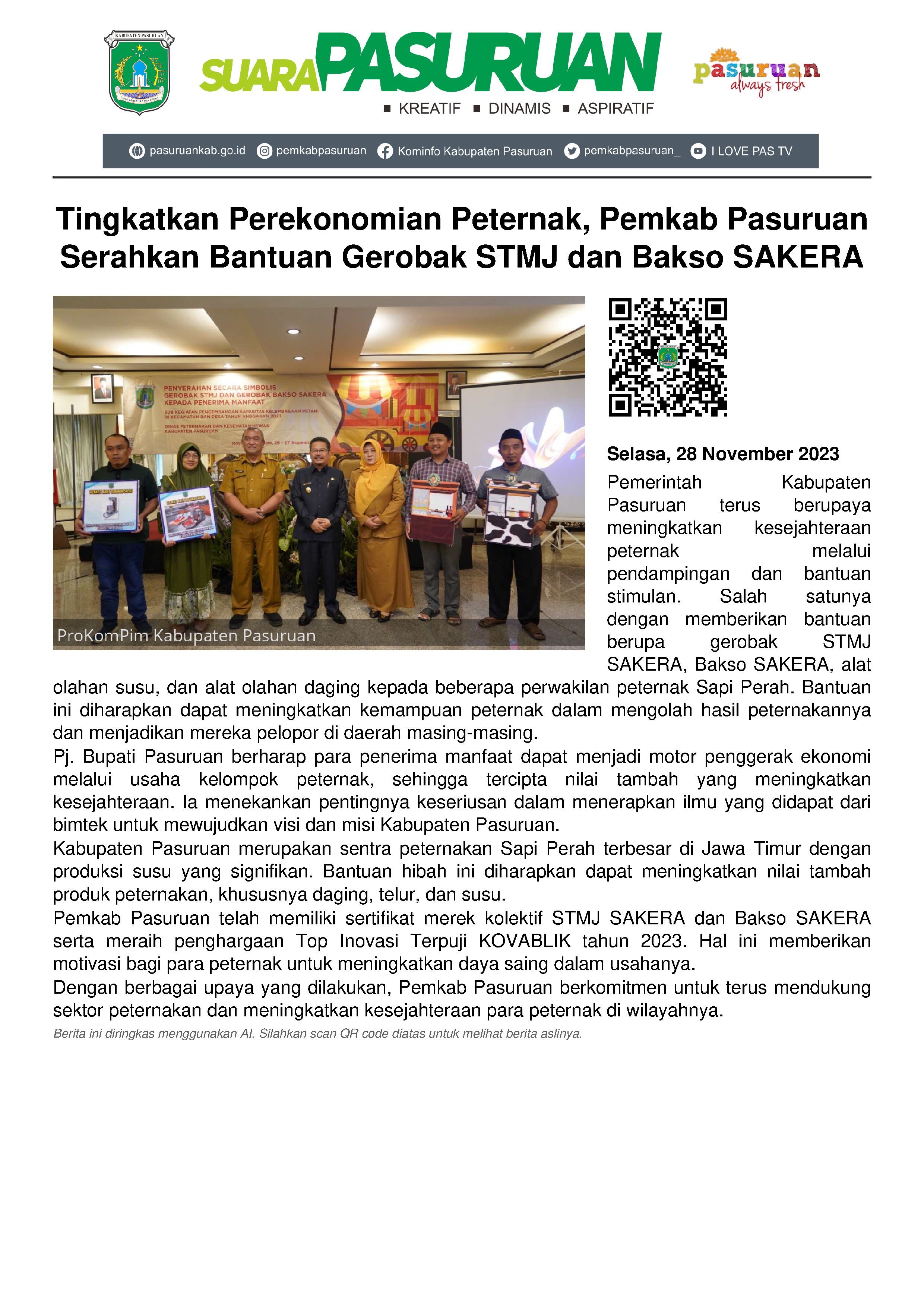Kata Pj. Bupati Pasuruan, pemberian bantuan hibah berupa gerobak STMJ dan Bakso SAKERA merupakan strategi Pemerintah Kabupaten Pasuruan untuk meningkatkan skill dan kemampuan peternak dalam mengolah hasil peternakannya. Harapannya, penerima manfaat akan menjadi pelopor di daerahnya masing-masing.