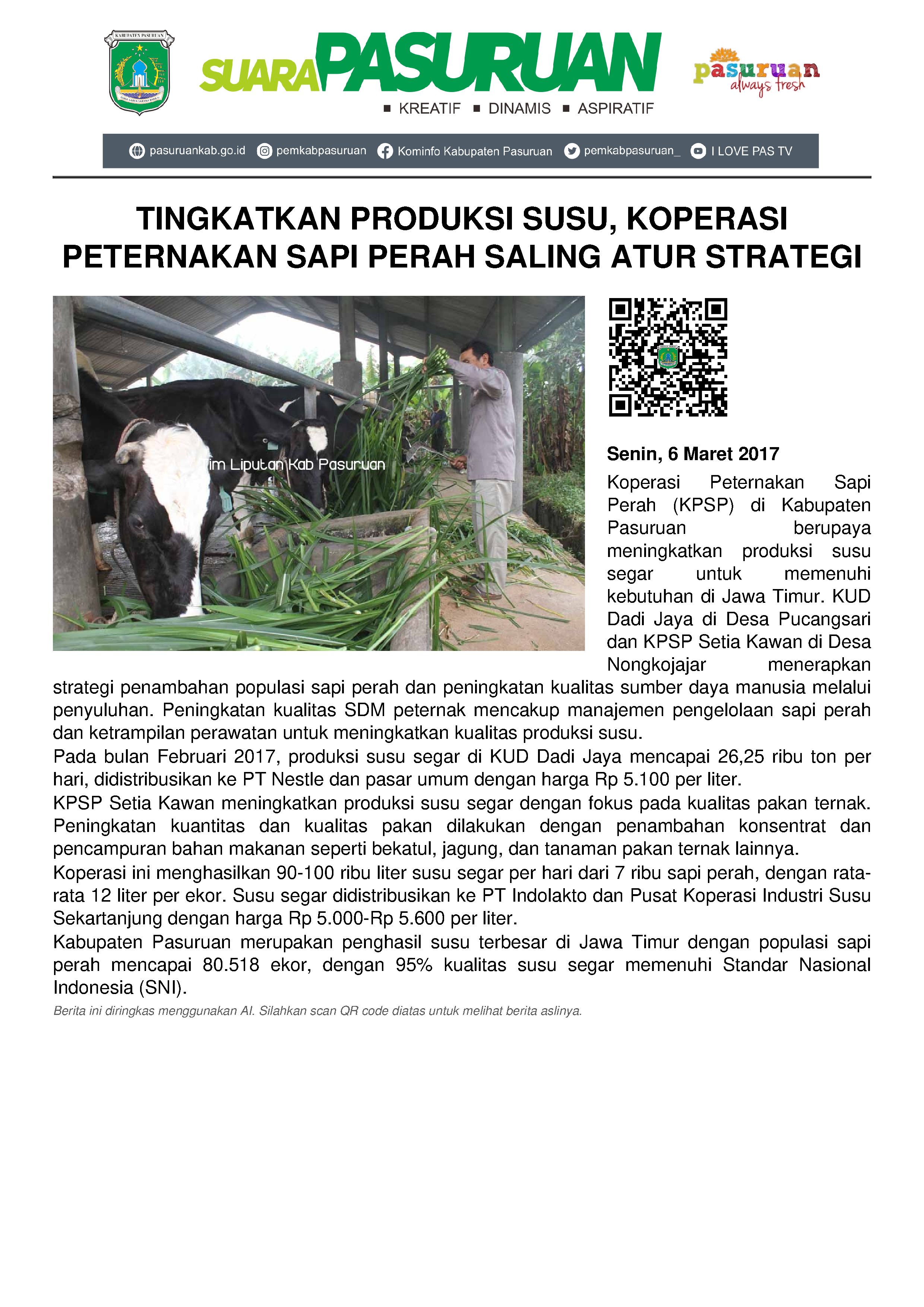 Untuk memenuhi kebutuhan susu segar di Jawa Timur, Koperasi Peternakan Sapi Perah (KPSP) di Kabupaten Pasuruan terus berupaya meningkatkan hasil produksi susu segar. Dua diantaranya dilakukan oleh KUD Dadi Jaya di Desa Pucangsari Kecamatan Purwosari dan KPSP Setia Kawan di Desa Nongkojajar Kecamatan Tutur.
