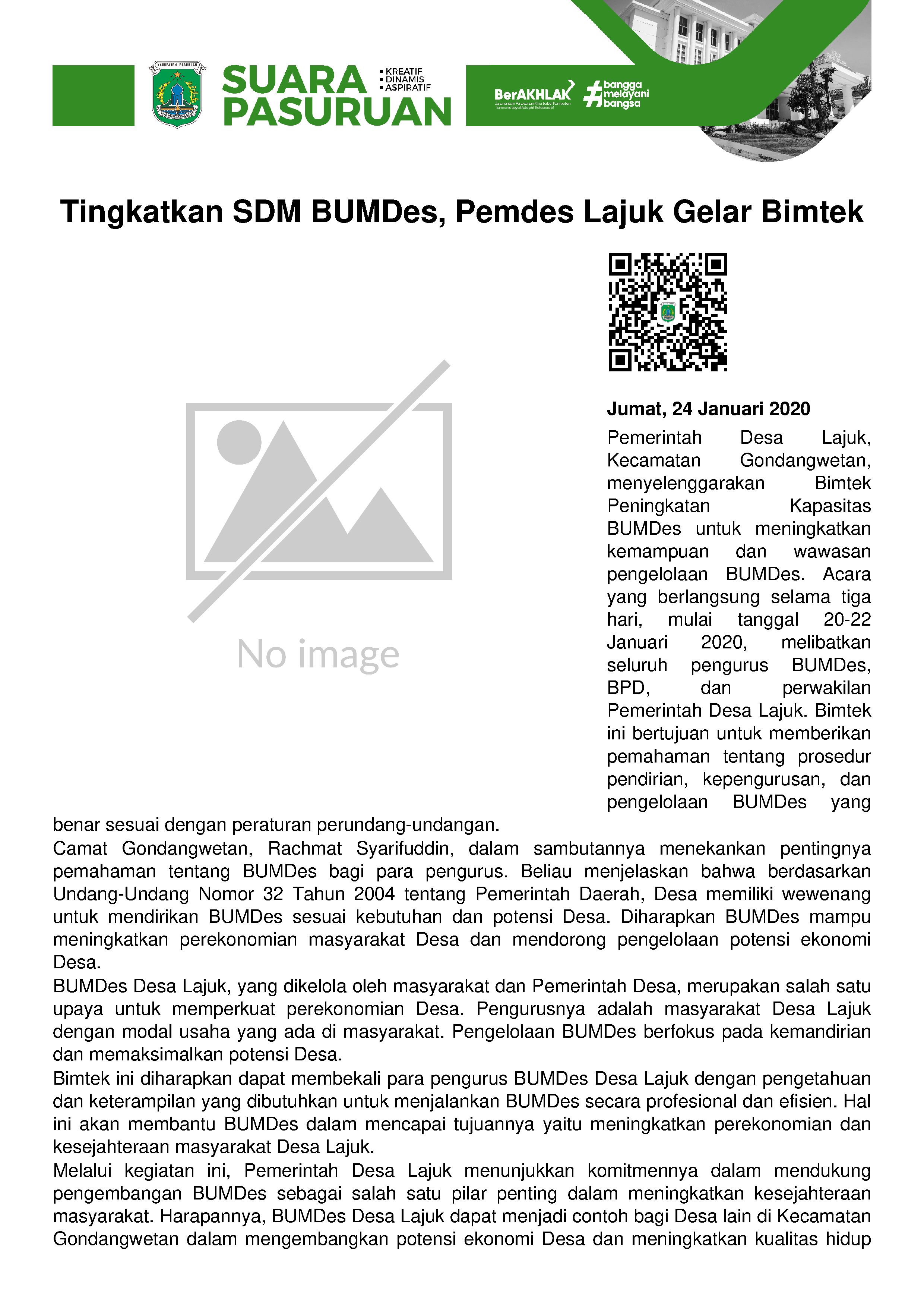 Untuk meningkatkan kemampuan dan wawasan Badan Usaha Milik Desa (BUMDes) di dalam manajemen pengelolaan, Pemerintah Desa Lajuk, Kecamatan Gondangwetan mengikutsertakan seluruh pengurus BUMDes, Badan Permusyawaratan Desa (BPD) serta perwakilan Pemerintah Desa Lajuk mengikuti Bimtek Peningkatan Kapasitas BUMDes. Dilaksanakan selama tiga hari mulai tanggal 20-22 Januari 2020 di Desa Sekar Putih Kecamatan Gondangwetan, acara tersebut dibuka langsung oleh Camat Gondangwetan, Rachmat Syarifuddin.