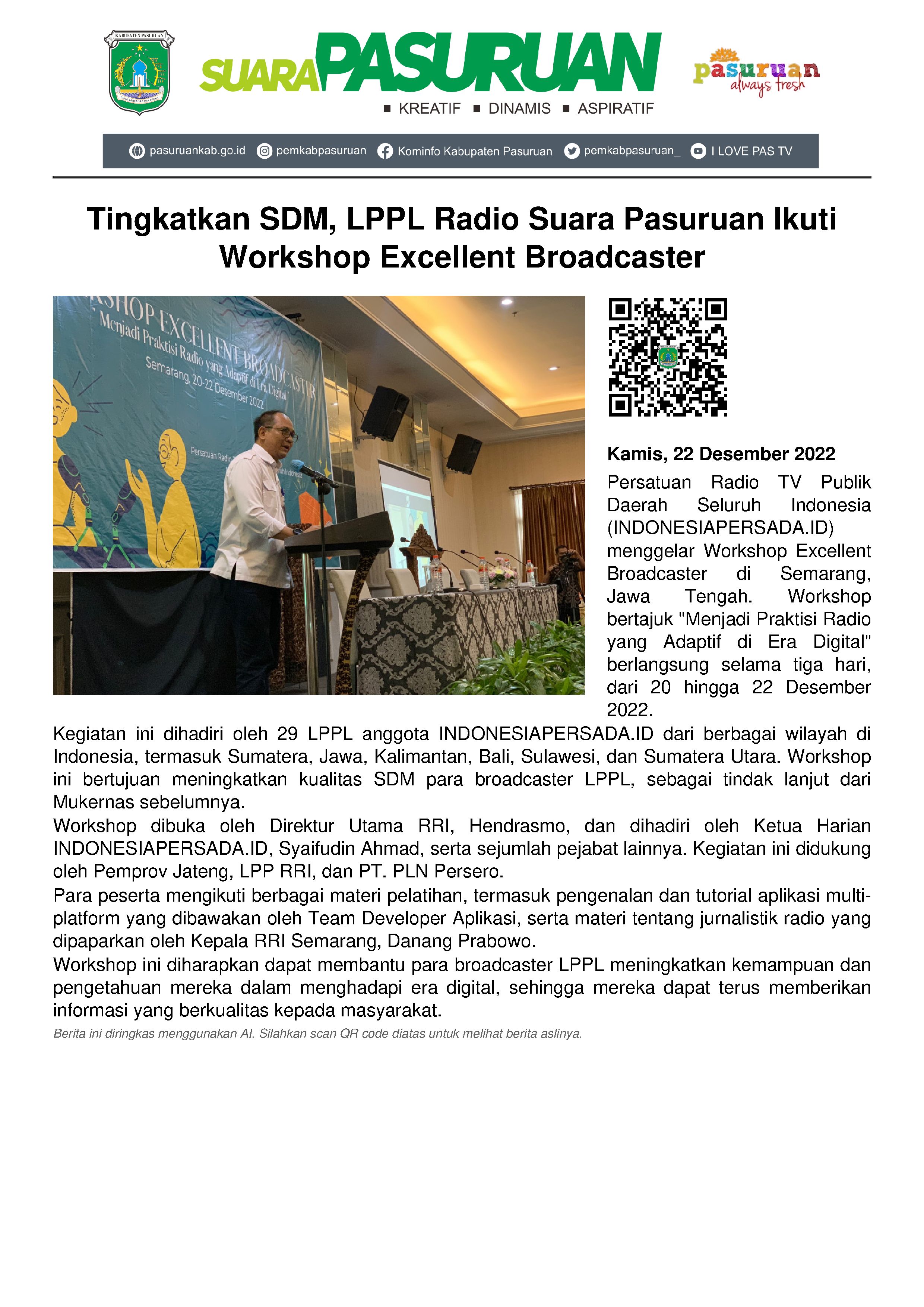 Persatuan Radio TV Publik Daerah Seluruh Indonesia (INDONESIAPERSADA.ID) menggelar kegiatan Workshop Excellent Broadcaster " Menjadi Praktisi Radio yang Adaptif di Era Digital " di Dafam Hotel Semarang, Jawa Tengah.
