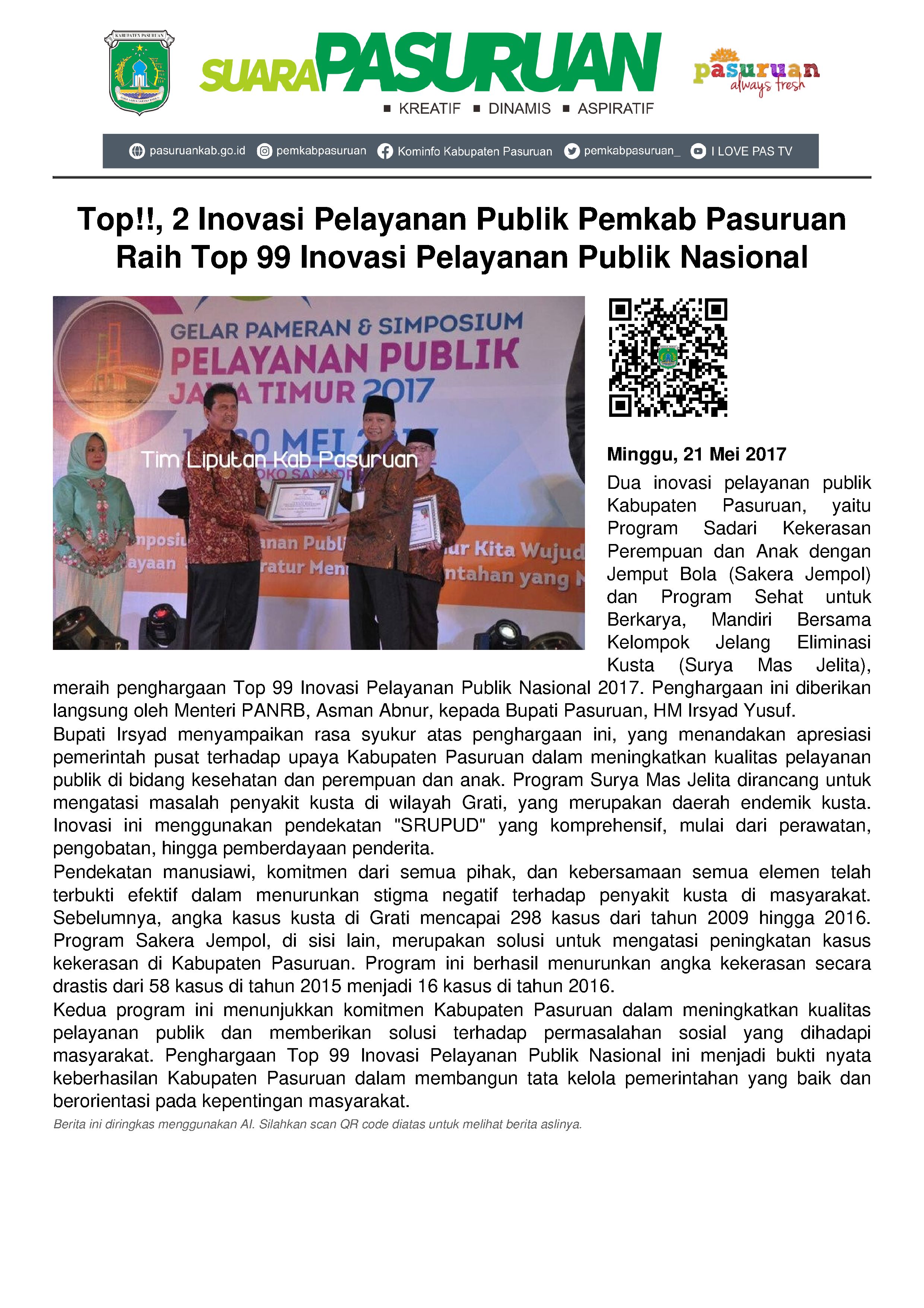 Program Sadari Kekerasan Perempuan dan Anak dengan Jemput Bola serta (Sakera Jempol) dan Program Sehat untuk Berkarya, Mandiri Bersama Kelompok Jelang Eliminasi Kusta (Surya Mas Jelita) menjadi Top 99 Inovasi Pelayanan Publik 2017 dari Kementerian Pendayagunaan Aparatur Negara dan Reformasi Birokrasi (MenPANRB). Penghargaan tersebut diberikan langsung oleh Menteri PANRB, Asman Abnur kepada Bupati Pasuruan, HM Irsyad Yusuf, dalam acara Gelar Pameran dan Simposium Pelayanan Publik Jawa Timur tahun 2017, di Gelora Joko Samudro, Gresik, Sabtu (20/05/2017) malam.