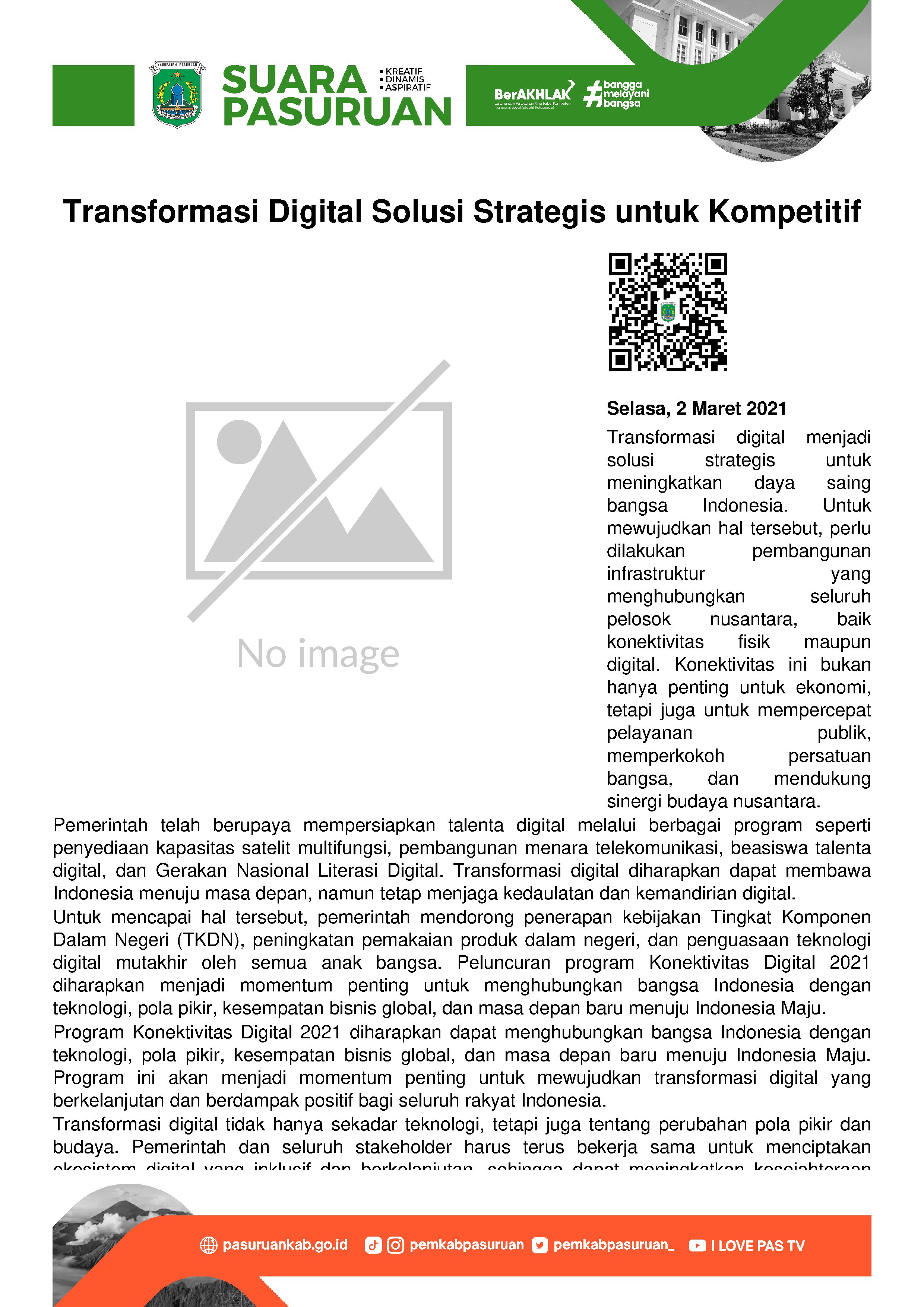 Transformasi digital adalah solusi strategis bagi bangsa Indonesia agar lebih kompetitif. Oleh karena itu, pembangunan infrastruktur peningkatan konektivitas fisiknya harus dibarengi dengan pembangunan konektivitas digital yang menghubungkan seluruh pelosok nusantara.