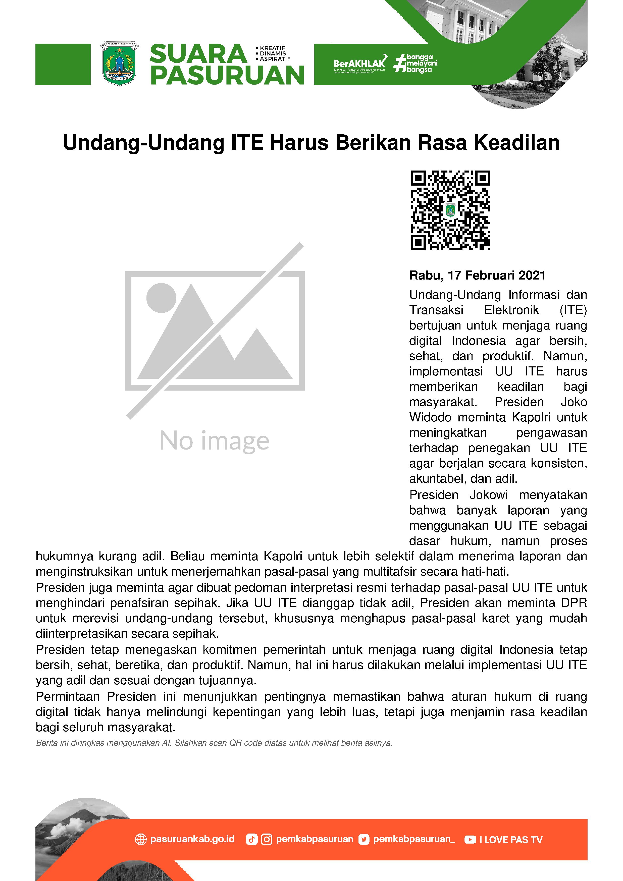 Meskipun Undang-Undang Informasi dan Transaksi Elektronik (ITE) bertujuan untuk menjaga agar ruang digital Indonesia agar selalu bersih, sehat, beretika dan produktif, dalam implementasinya harus tetap memberikan keadilan bagi masyarakat. Oleh karena itu, Presiden Joko Widodo meminta Kepala Kepolisian Negara Republik Indonesia (Kapolri) untuk meningkatkan pengawasannya.