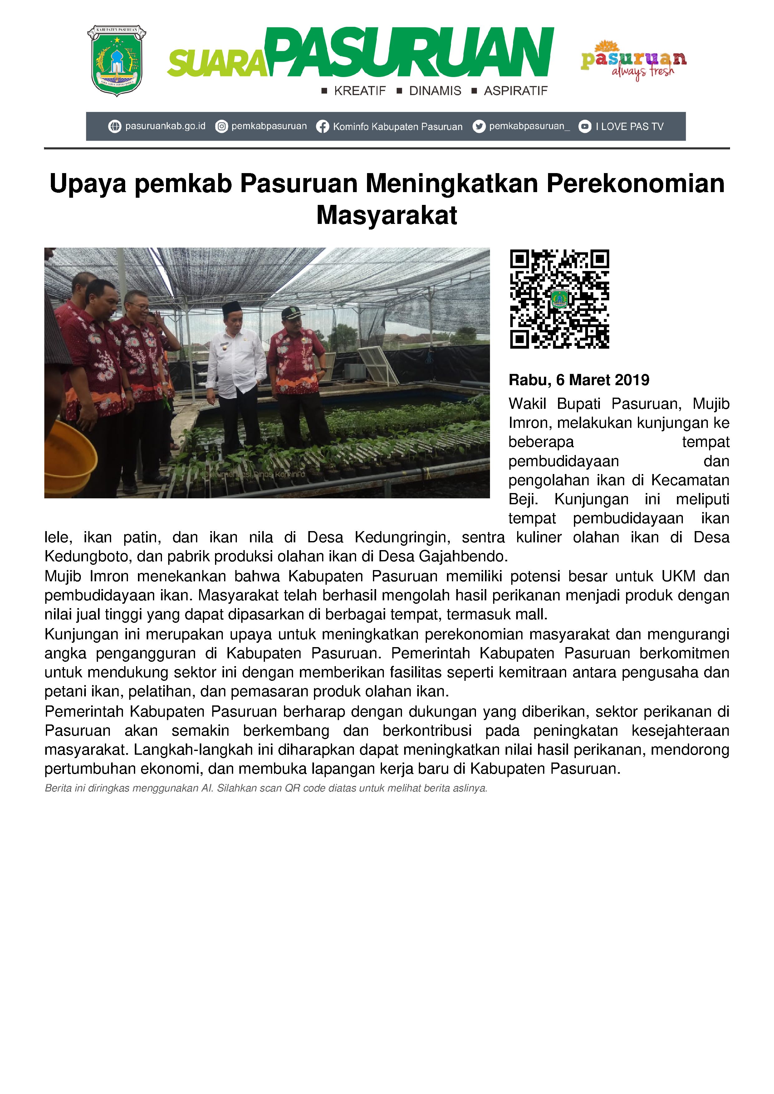 “Nanti akan dikoordinasikan dan saya laporkan ke Bapak Bupati untuk ditindaklanjuti bagaimana potensi Pasuruan baik pembudidayaan lele, patin, nila, dan sebagainya semakin bisa diandalkan sehingga akan menambah nilai dan meningkatnya perekonomian di Pasuruan serta menurunkan tingkat pengangguran ke depannya semakin menurun,” ujarnya.