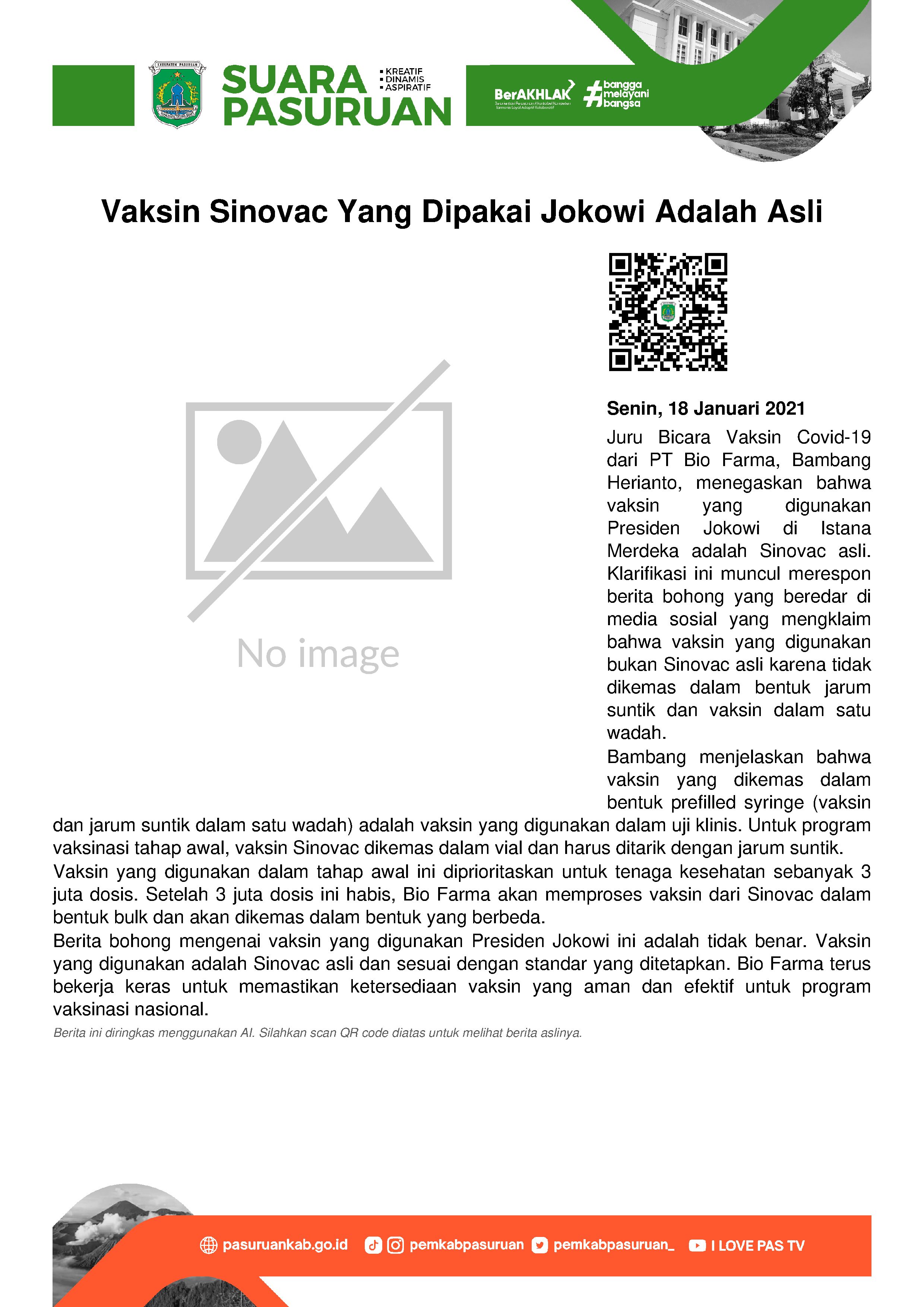 Juru Bicara Vaksin Covid-19 dari PT Bio Farma, Bambang Herianto menjelaskan bahwa pesan yang beredar di media sosial Facebook yang menyebutkan bahwa vaksin yang digunakan Presiden Jokowi di Istana Merdeka, Jakarta, Rabu (16/1/2021) adalah Sinovac asli. Klarifikasi tersebut disampaikan merespon ramainya hoax atau kabar bohong yang menyebutkan bahwa vaksin yang disuntikkan ke Presiden, bukan Sinovac asli. Asumsinya, vaksin harus dimasukkan ke dalam alat suntik.