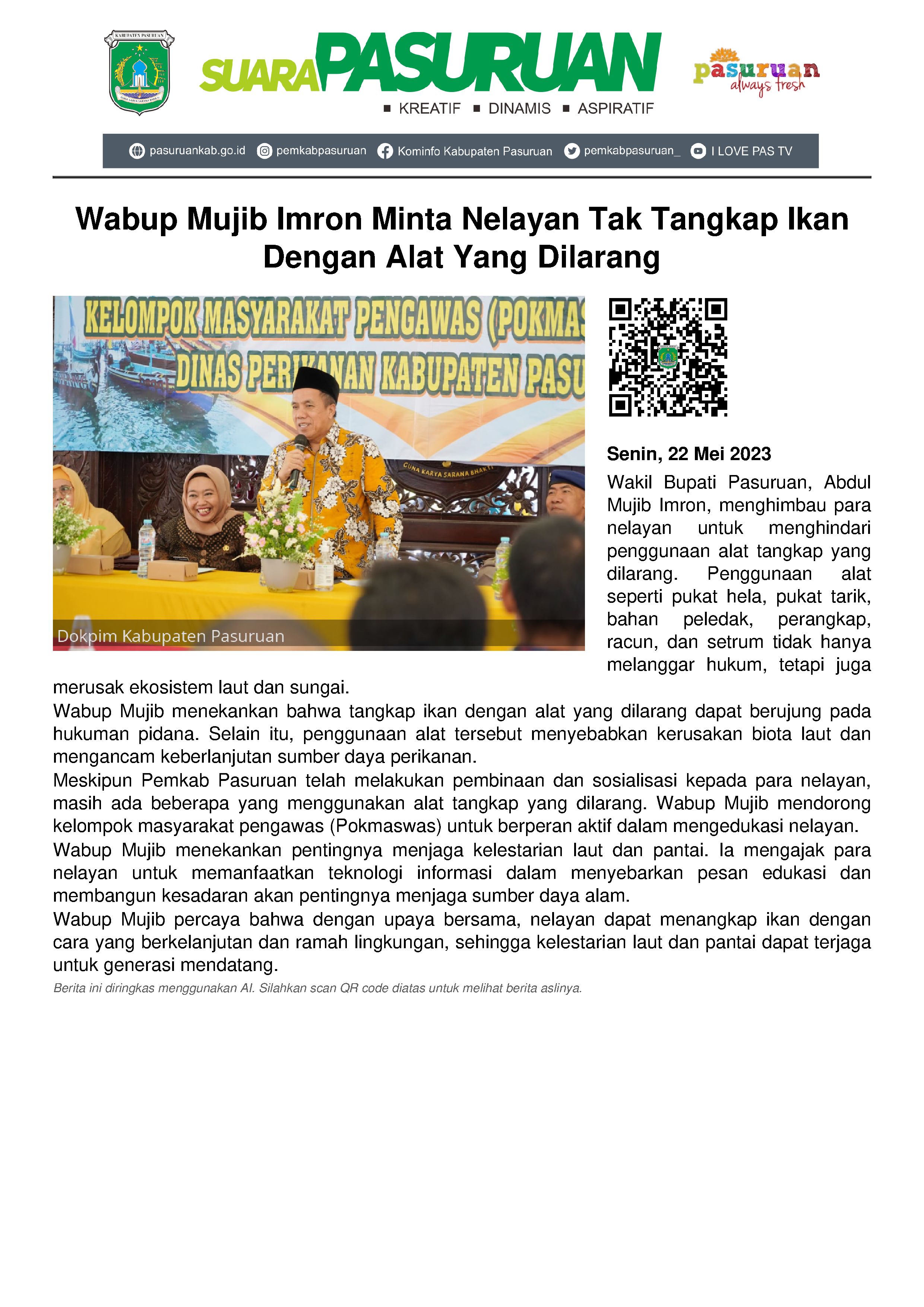 Permintaan ini disampaikan Wabup Mujib saat membuka pembinaan kelompok masyarakat pengawas (Pokmaswas) pesisir/laut di Pendopo Kecamatan Kraton, Senin (22/05/2023).
