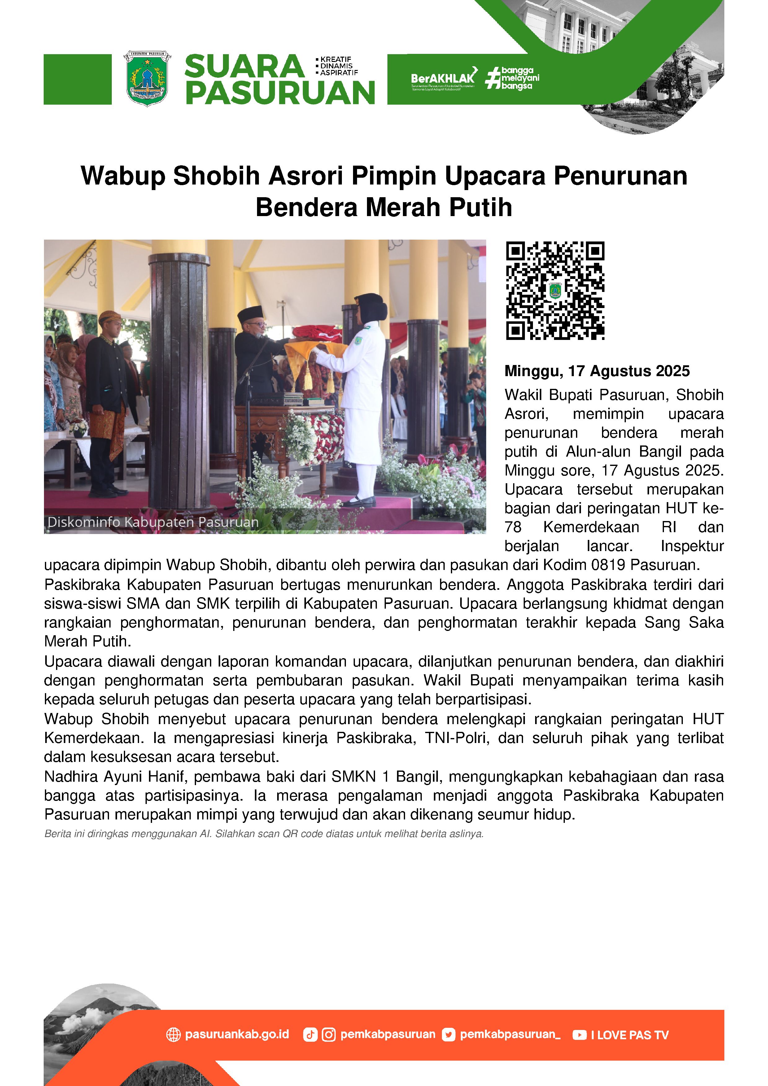 Menurut Gus Shobih, upacara penurunan bendera merah putih menjadi pelengkap acara pengibaran bendera yang telah dilaksanakan pada Minggu (17/8/2025) pagi.
