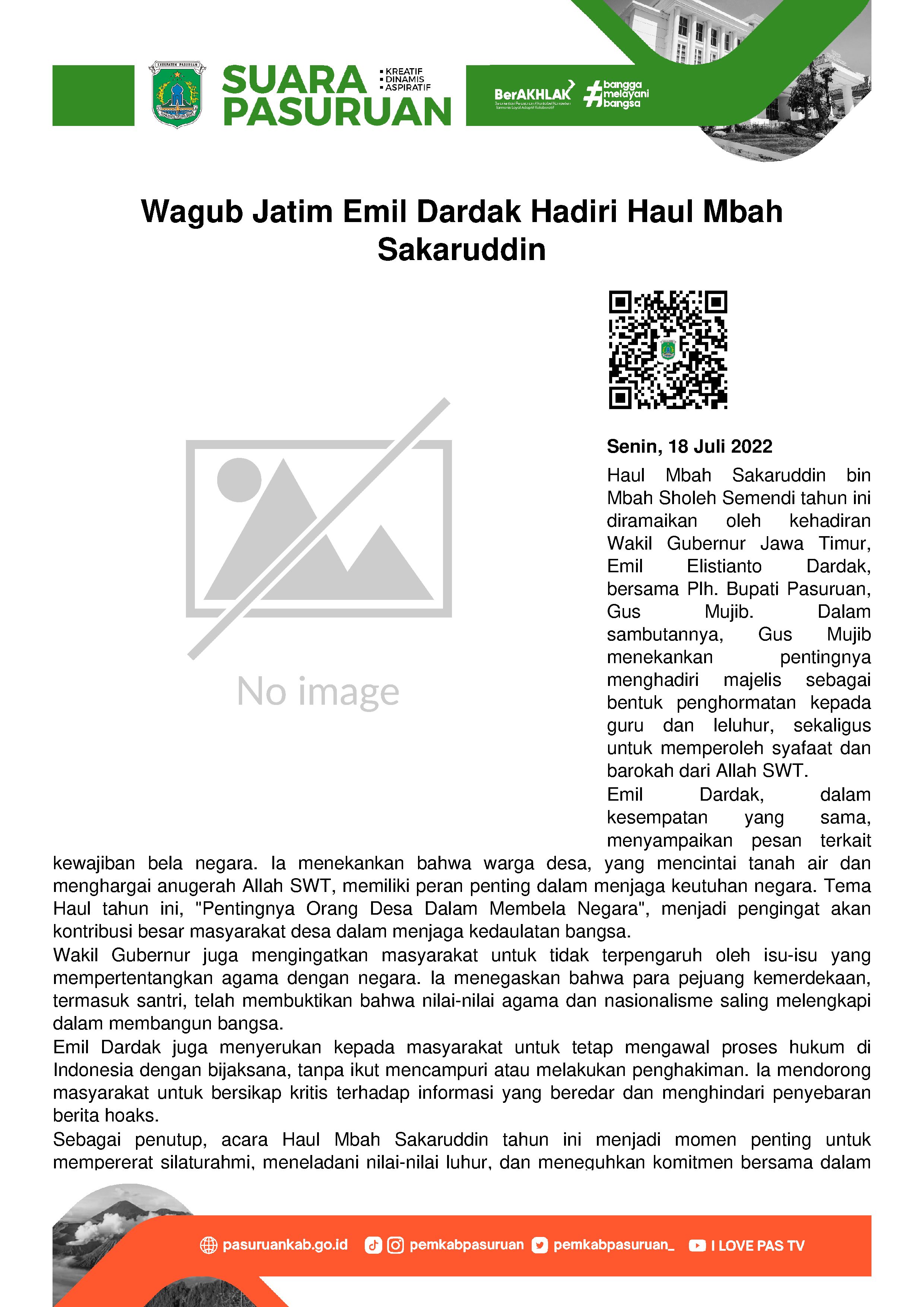 Ada yang istimewa dalam acara Haul Mbah Sakaruddin bin Mbah Sholeh Semendi tahun ini. Kehadiran Plh. Bupati Pasuruan yang turut hadir di Masjid Tiban Mbah Sakarudin, Keboncandi, Kecamatan Gondangwetan tersebut ditemani Wakil Gubernur Jawa Timur, Emil Elistianto Dardak.