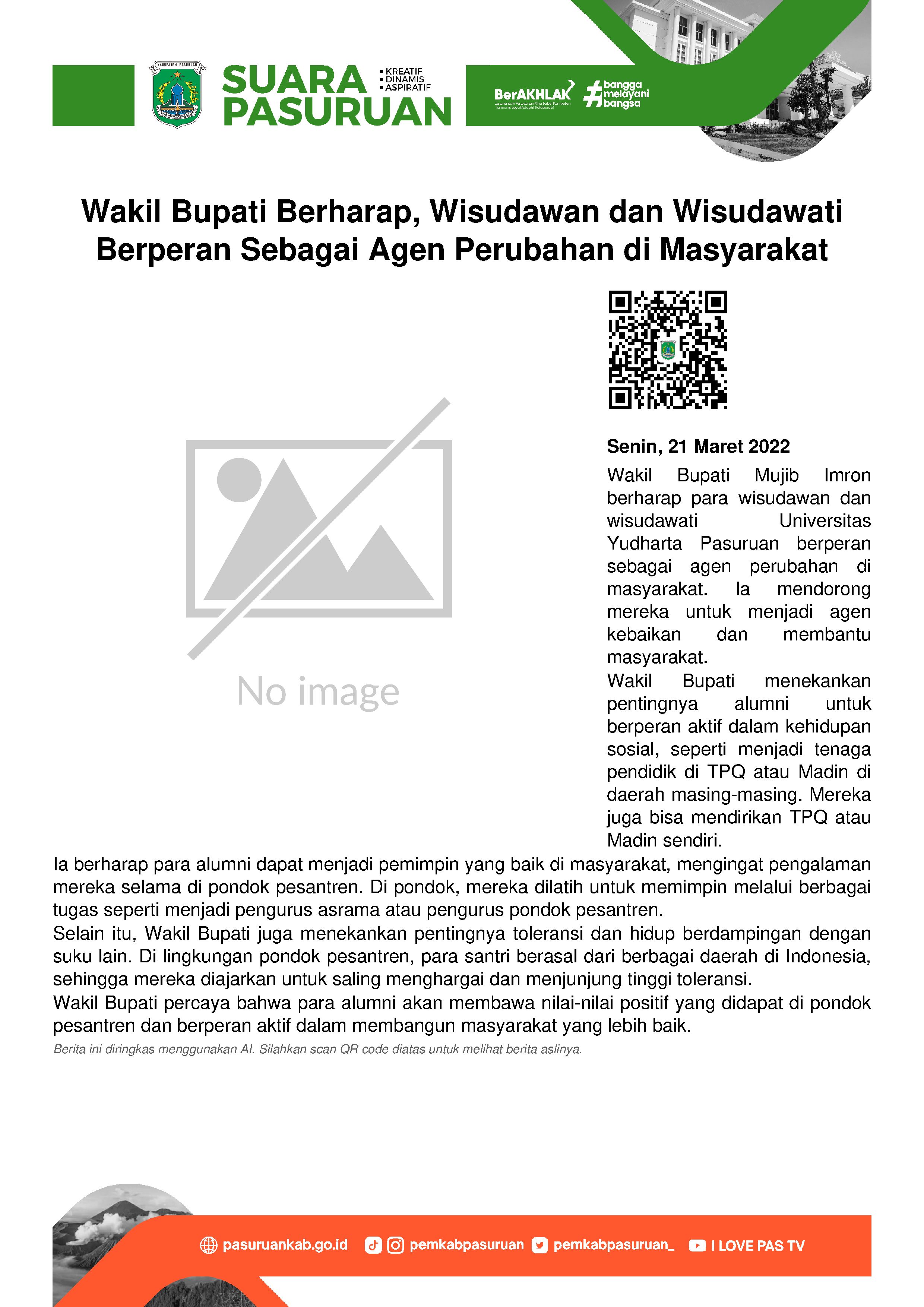 Alumni civitas akademika harus mampu berperan sebagai agen perubahan di masyarakat. Tidak terkecuali dalam melakukan perubahan untuk kebaikan. Harapan itu disampaikan Wakil Bupati Mujib Imron pada saat menghadiri Haflah ke-33 Universitas Yudharta Pasuruan.