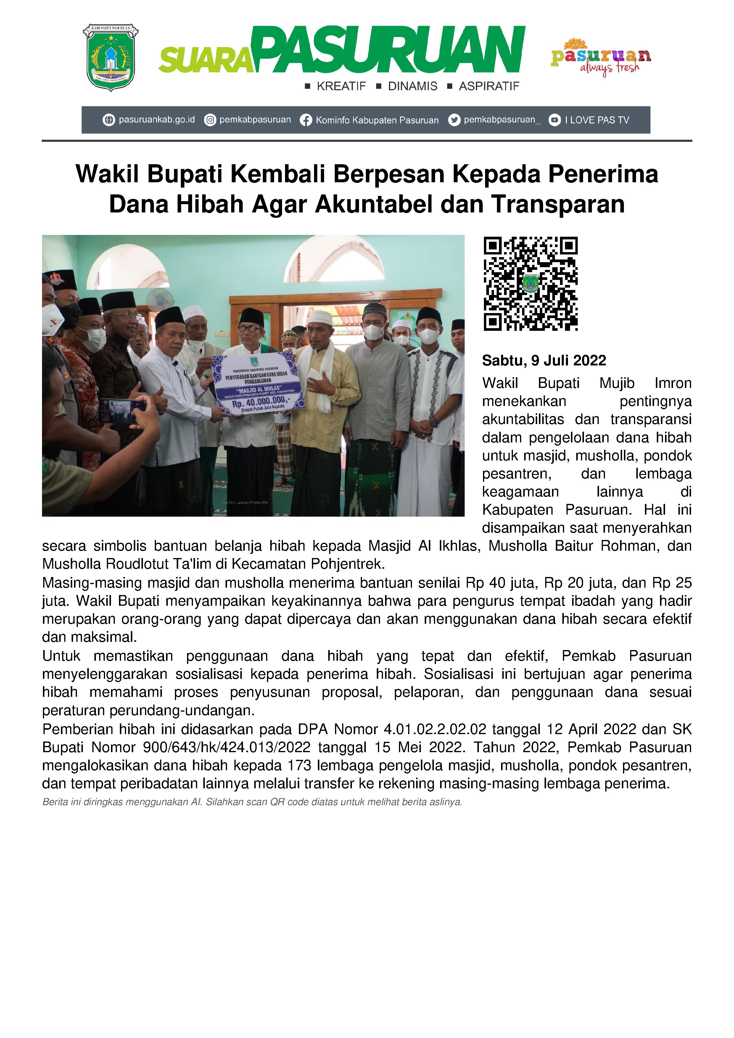 Diketahui, sepanjang tahun 2022, Pemkab Pasuruan mengalokasikan bantuan hibah kepada ratusan lembaga pengelola masjid, musholla, pondok pesantren dan tempat peribadatan lainnya yang bersumber dari Anggaran Pendapatan Belanja Daerah (APBD) Kabupaten Pasuruan tahun 2022. Total ada 173 lembaga yang akan menerima bantuan hibah dengan sistem transfer melalui rekening atas nama lembaga masing-masing penerima bantuan. (Eka Maria)