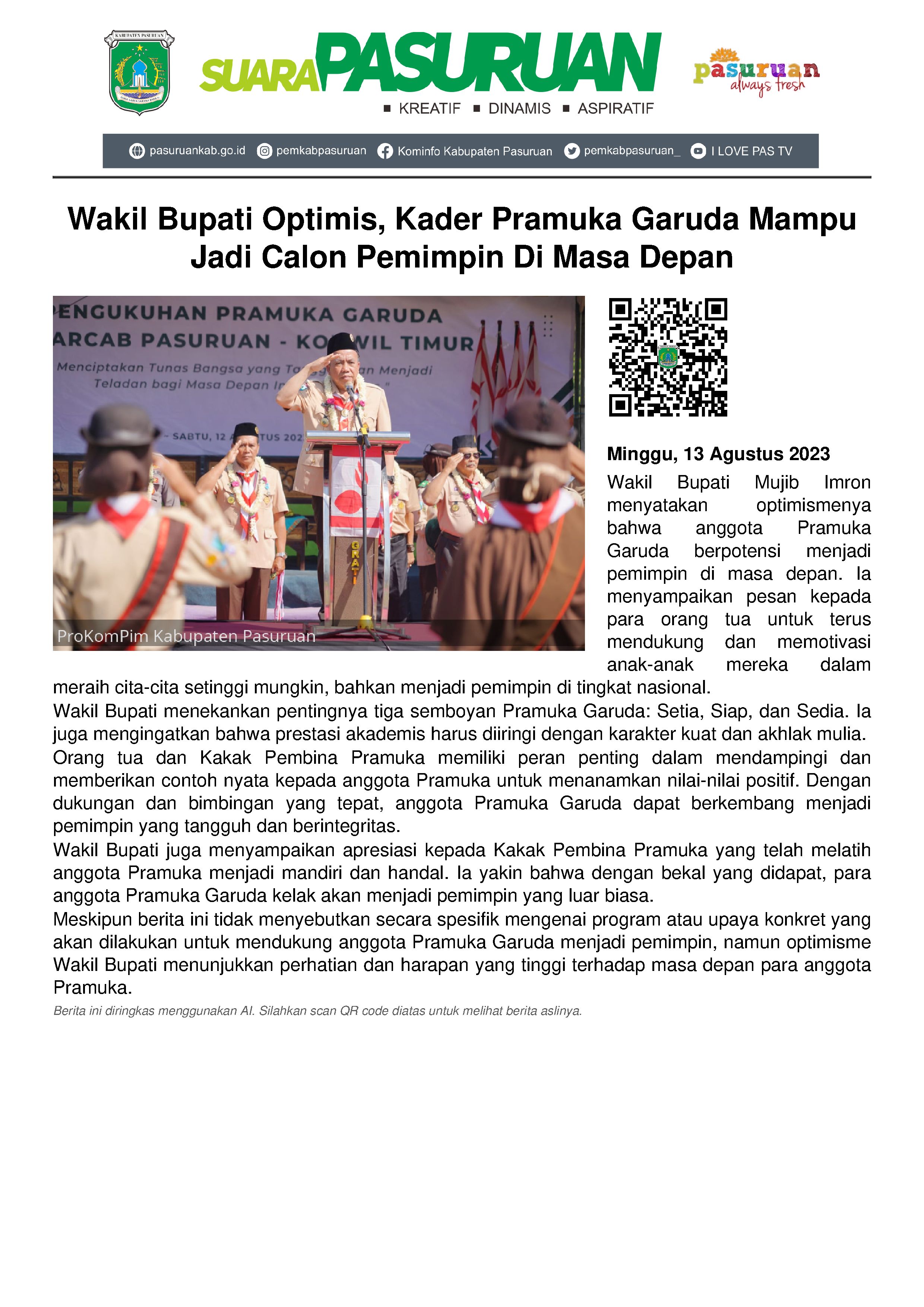 Seluruh anggota Pramuka sangat berpeluang menjadi calon pemimpin dan orang-orang sukses di masa mendatang. Pernyataan bernada optimis itu dilontarkan oleh Wakil Bupati Mujib Imron seusai mengukuhkan Pramuka Garuda Kwarcab Pasuruan Wilayah Selatan yang digelar di Rest Area Tutur pada hari Sabtu (12/8/2023).