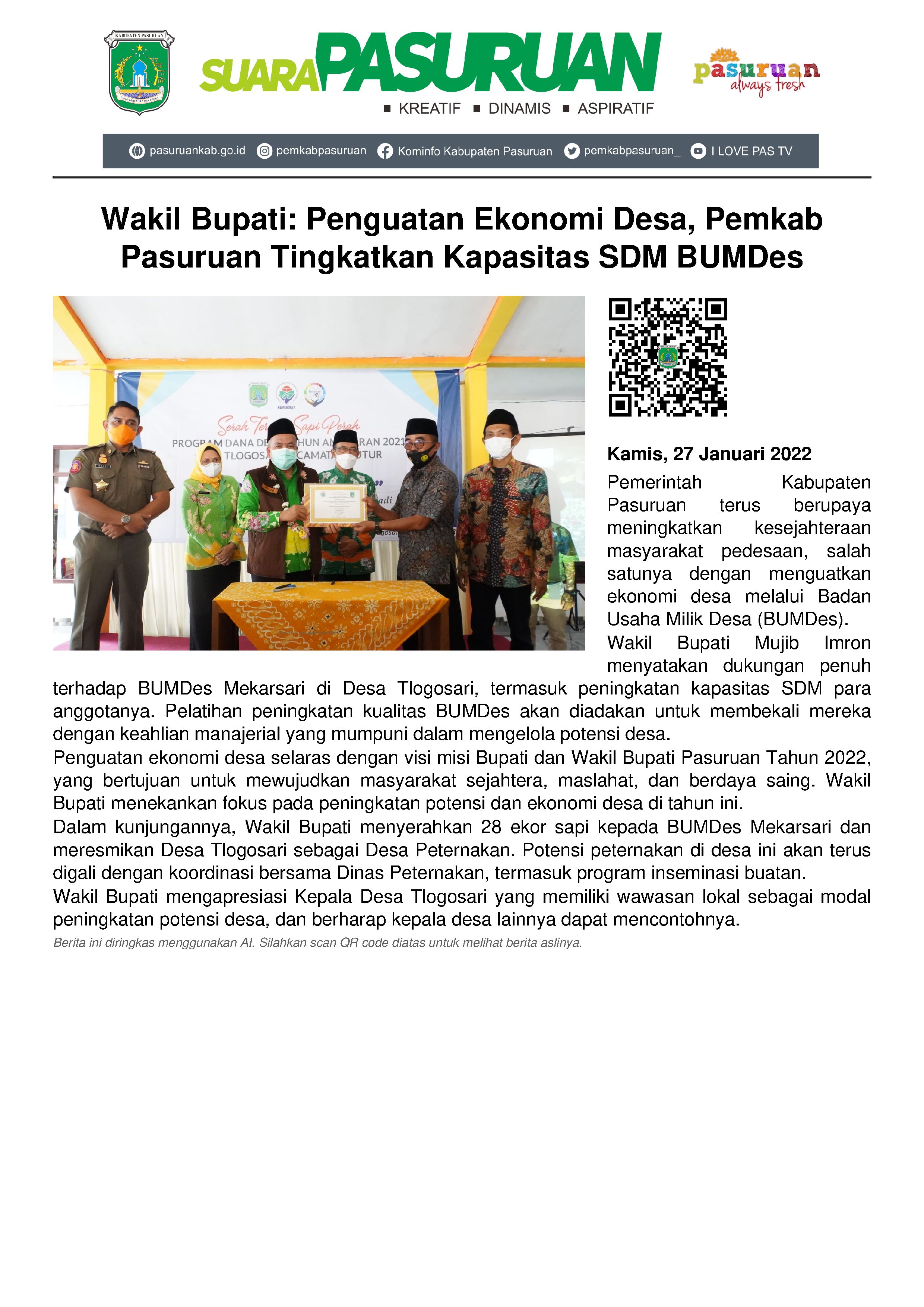 Banyak cara yang terus dimaksimalkan Pemerintah Kabupaten Pasuruan untuk meningkatkan kesejahteraan masyarakat pedesaan. Diantaranya dengan lebih menguatkan sektor perekonomian melalui Badan Usaha Milik Desa (BUMDes).