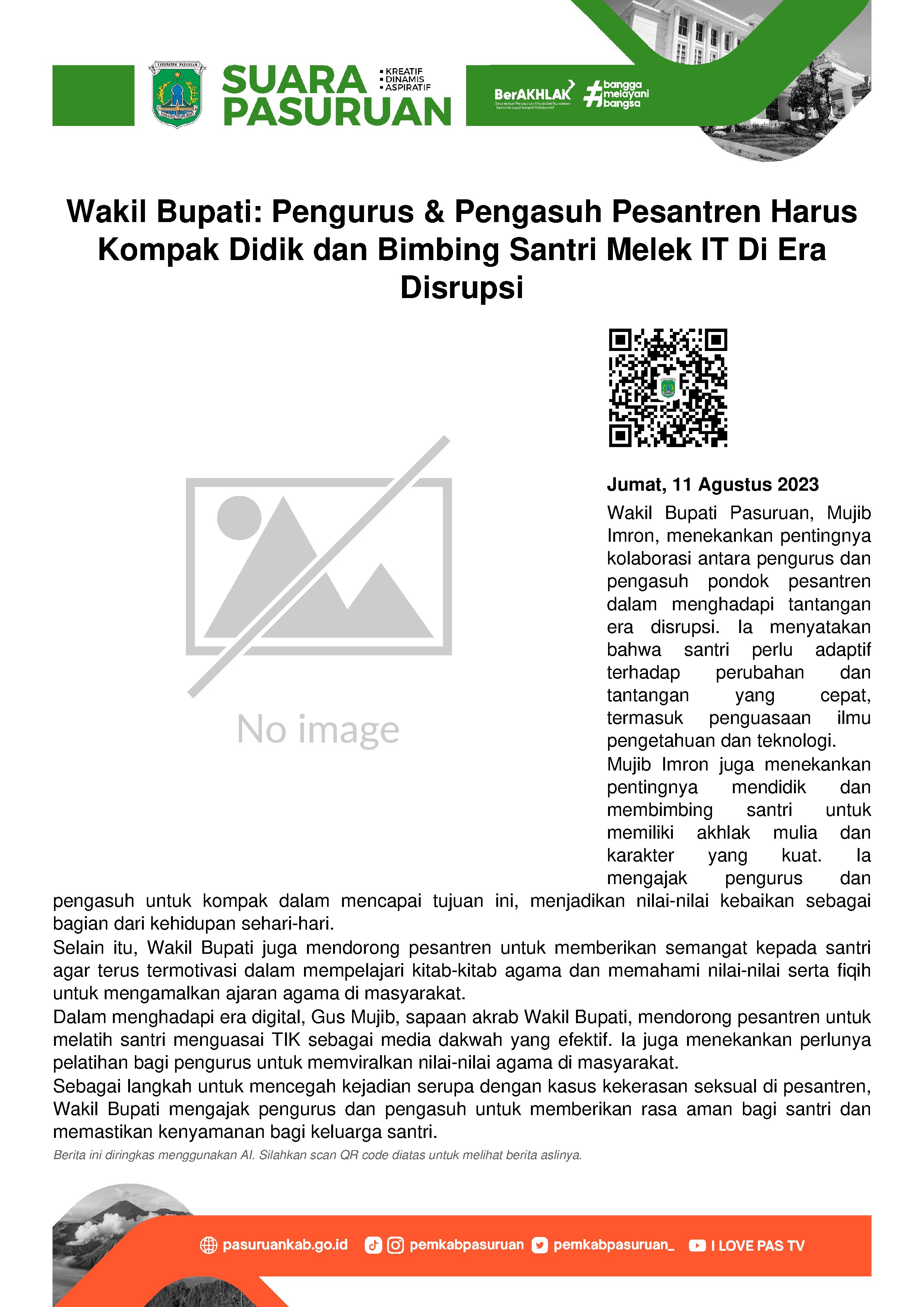 Agar eksistensi Pesantren sebagai lembaga pendidikan dan pengajaran agama Islam di era disrupsi terus meningkat, baik pengurus maupun pengasuh Pondok Pesantren (Ponpes) di Kabupaten Pasuruan sudah sepatutnya saling memacu diri. Hal itu diungkapkan oleh Wakil Bupati Mujib Imron merespon pernyataan Wakil Presiden Amin Ma'ruf terhadap tantangan metode pembelajaran di Pesantren di masa kini yang harus melek sains dan teknologi.