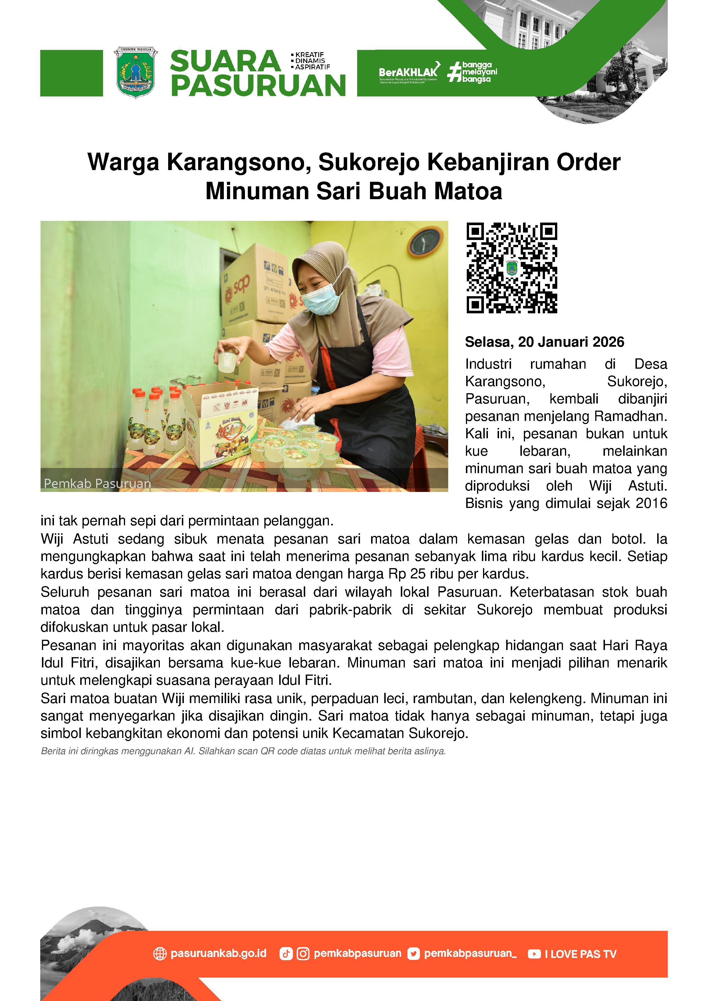 Lebih lanjut Wiji menegaskan bahwa Sari Matoa bukan hanya sekadar minuman, tetapi simbol kebangkitan ekonomi dan potensi unik Kecamatan Sukorejo, Kabupaten Pasuruan.