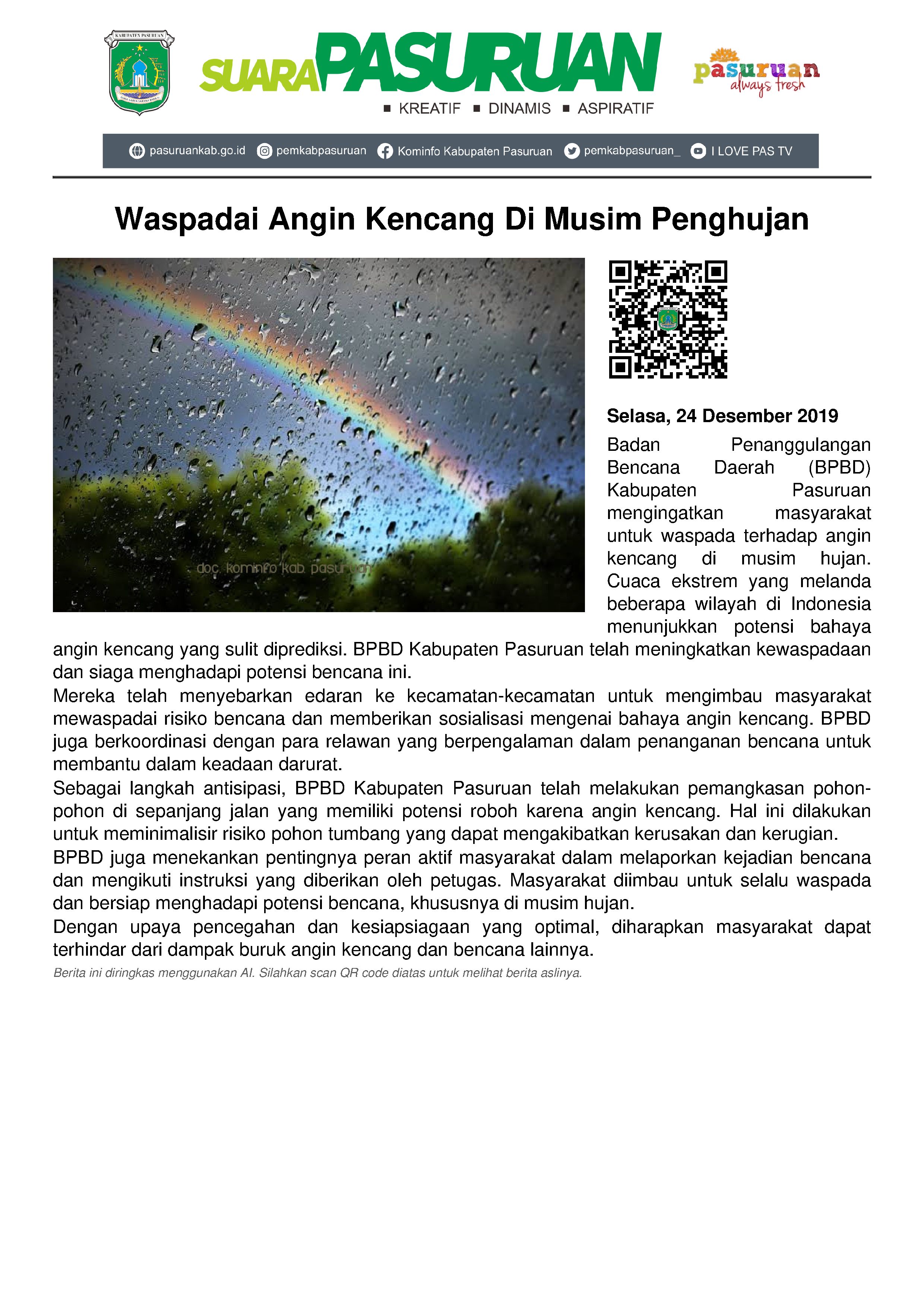 Badan Penanggulangan Bencana Daerah (BPBD) Kabupaten Pasuruan mengingatkan masyarakat untuk mewaspadai ancaman bencana saat datangnya musim hujan. Khususnya bencana angin kencang yang sulit diprediksi keberadaannya.