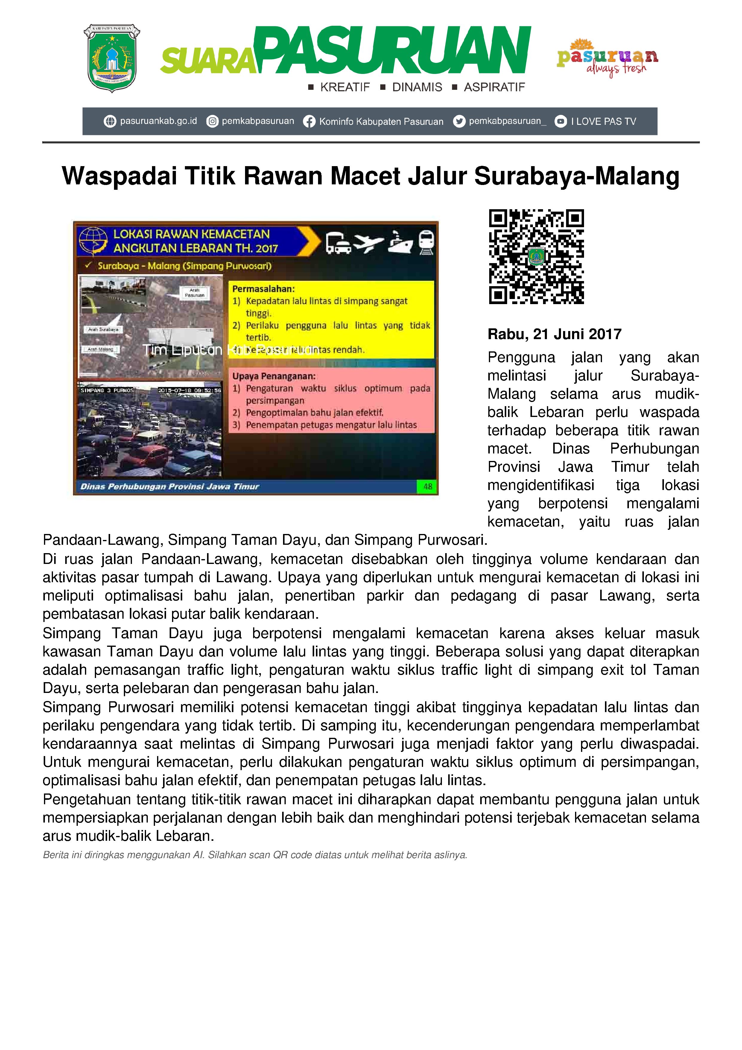 Dalam rilis Rencana Operasi Angkutan Lebaran Terpadu Tahun 2017 1438 H yang diterima Dinas Komunikasi dan Informatika (Kominfo) Kabupaten Pasuruan yang berisi infografis tentang sistem informasi dan kebijakan Dinas Perhubungan Provinsi Jawa Timur (Jatim), Dr. Ir. Wahid Wahyudi, MT Kepala Dinas Perhubungan Provinsi Jatim menyatakan bahwa ada 3 lokasi rawan macet di jalur Surabaya-Malang. Masing-masing, ruas jalan Pandaan-Lawang; Simpang Taman Dayu dan Simpang Purwosari.