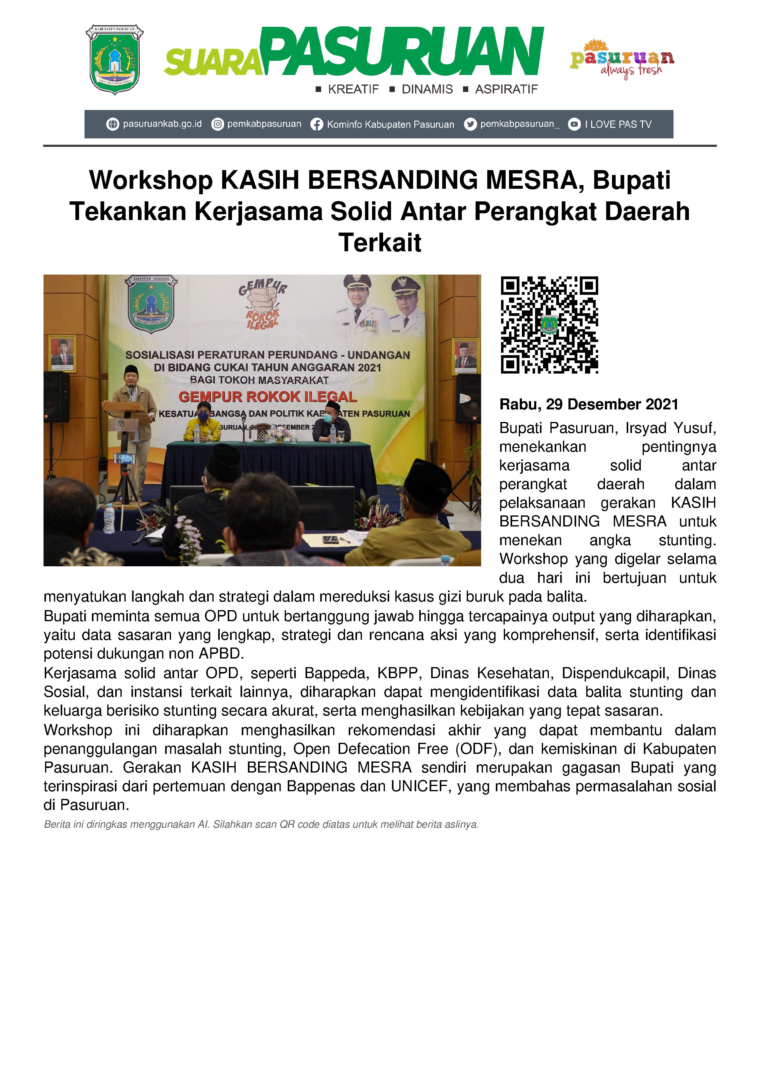 "Semua OPD harus bertanggungjawab hingga capaian output-nya KASIH BERSANDING MESRA betul-betul tercapai. Kita mencari inovasi yang efektif dan output-nya sesuai harapan,” pesan Bupati kepada seluruh peserta workshop yang dilaksanakan selama dua hari, 28-29 Desember 2021.