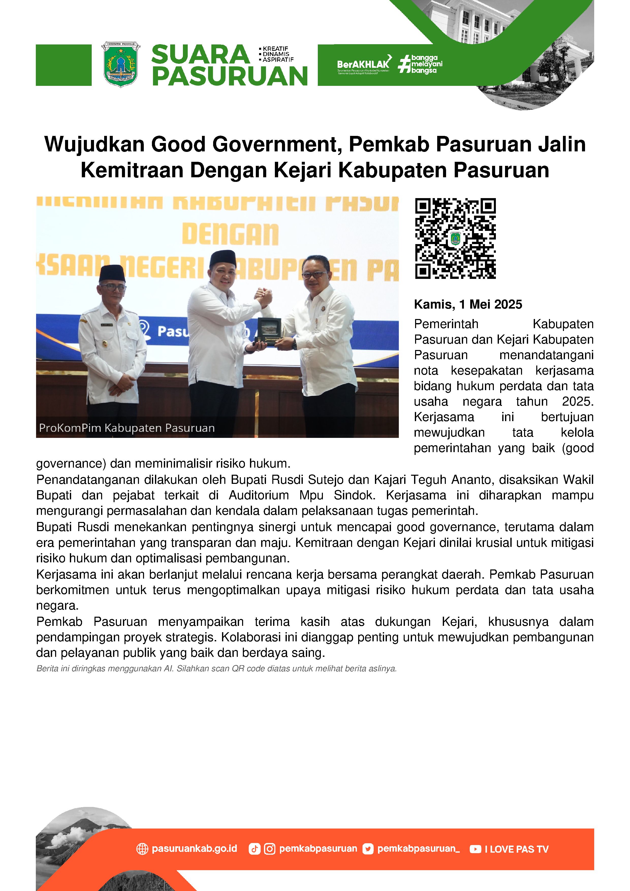Untuk mewujudkan tata kelola pemerintahan yang baik (good government), Pemerintah Daerah menjalin kemitraan dengan Kejaksaan Negeri (Kejari) Kabupaten Pasuruan. Hal itu ditandai dengan ditandatanganinya Nota Kesepakatan antara Pemerintah Kabupaten Pasuruan bersama Kejari terkait kerjasama di bidang Hukum Perdata dan Tata Usaha Negara Tahun 2025.