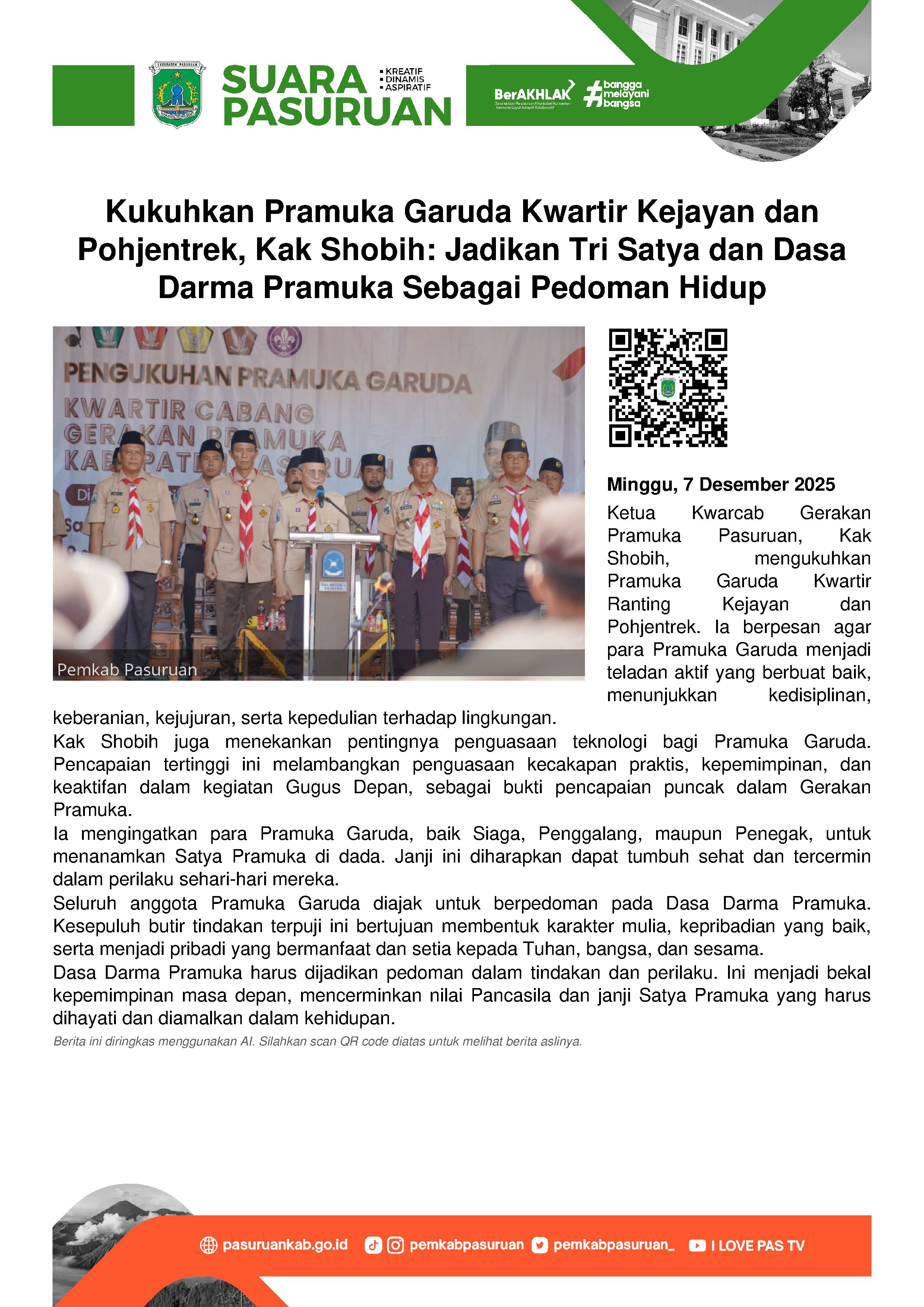 Disampaikan pada saat mengukuhkan Pramuka Garuda Kwarran Kejayan dan Pohjentrek pada hari Sabtu (6/12/2025), pria berkacamata yang saat ini menjabat sebagai Wakil Bupati Pasuruan tersebut juga menggarisbawahi tentang pentingnya penguasaan teknologi bagi seluruh Anggota Pramuka Garuda. Berikut, menunjukkan kecakapan praktis, kepemimpinan dan aktif dalam kegiatan Gugus Depan sebagai lambang pencapaian tertinggi di Gerakan Pramuka.