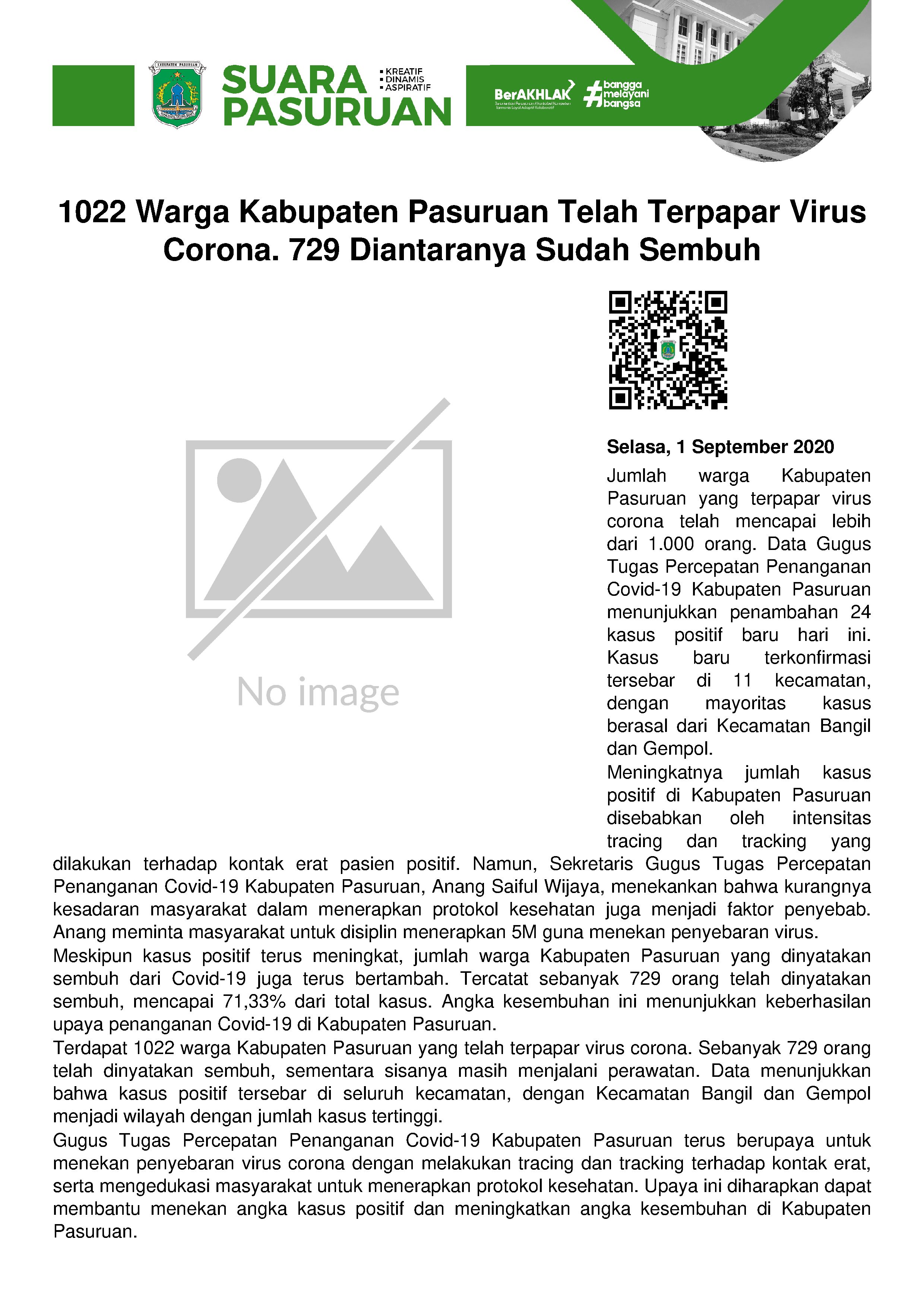 Sementara itu, dengan tambahan 24 pasien positif covid-19 hari ini, maka setidaknya sudah ada 1022 warga Kabupaten Pasuruan yang telah terpapar virus corona. Dengan rincian 149 warga Bangil, 220 warga Kecamatan Gempol, 87 warga Beji, 113 warga Pandaan, 66 warga Purwosari, 42 warga Prigen, 54 warga Sukorejo, 36 warga Kraton, 31 warga Rejoso, 33 warga Purwodadi, 31 warga Rembang, 33 warga Grati, 15 warga Pohjentrek, 23 warga Nguling, 23 warga Gondangwetan, 12 warga Winongan, 15 warga Lekok, 16 warga Kejayan, 7 warga Puspo, 7 warga Tutur, 4 warga Pasrepan, 4 warga Wonorejo, dan 1 warga Lumbang.