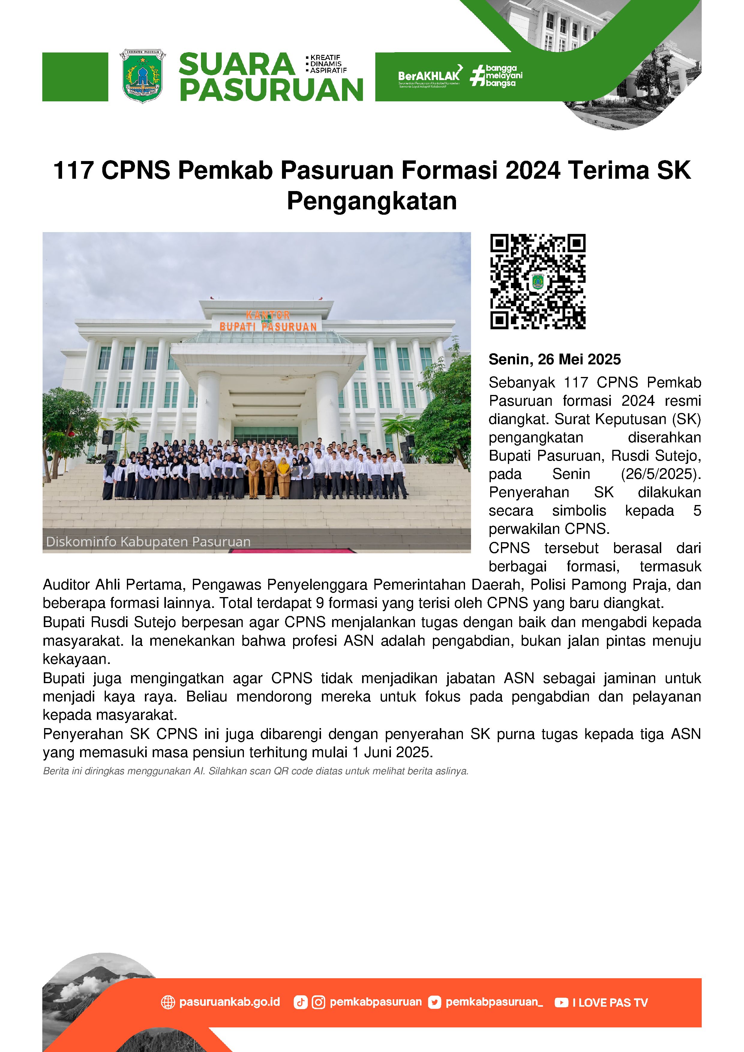 Sementara itu, Kepala Badan Kepegawaian dan Pengembangan Sumber Daya Manusia (BKPSDM) Kabupaten Pasuruan, Ninuk Ida Suryani menjelaskan, agenda penyerahan SK CPNS Formasi 2024 juga dibarengkan dengan penyerahan SK Purna Tugas Aparatur Sipil Negara (ASN) Terhitung Mulai Tanggal (TMT) 1 Juni 2025.