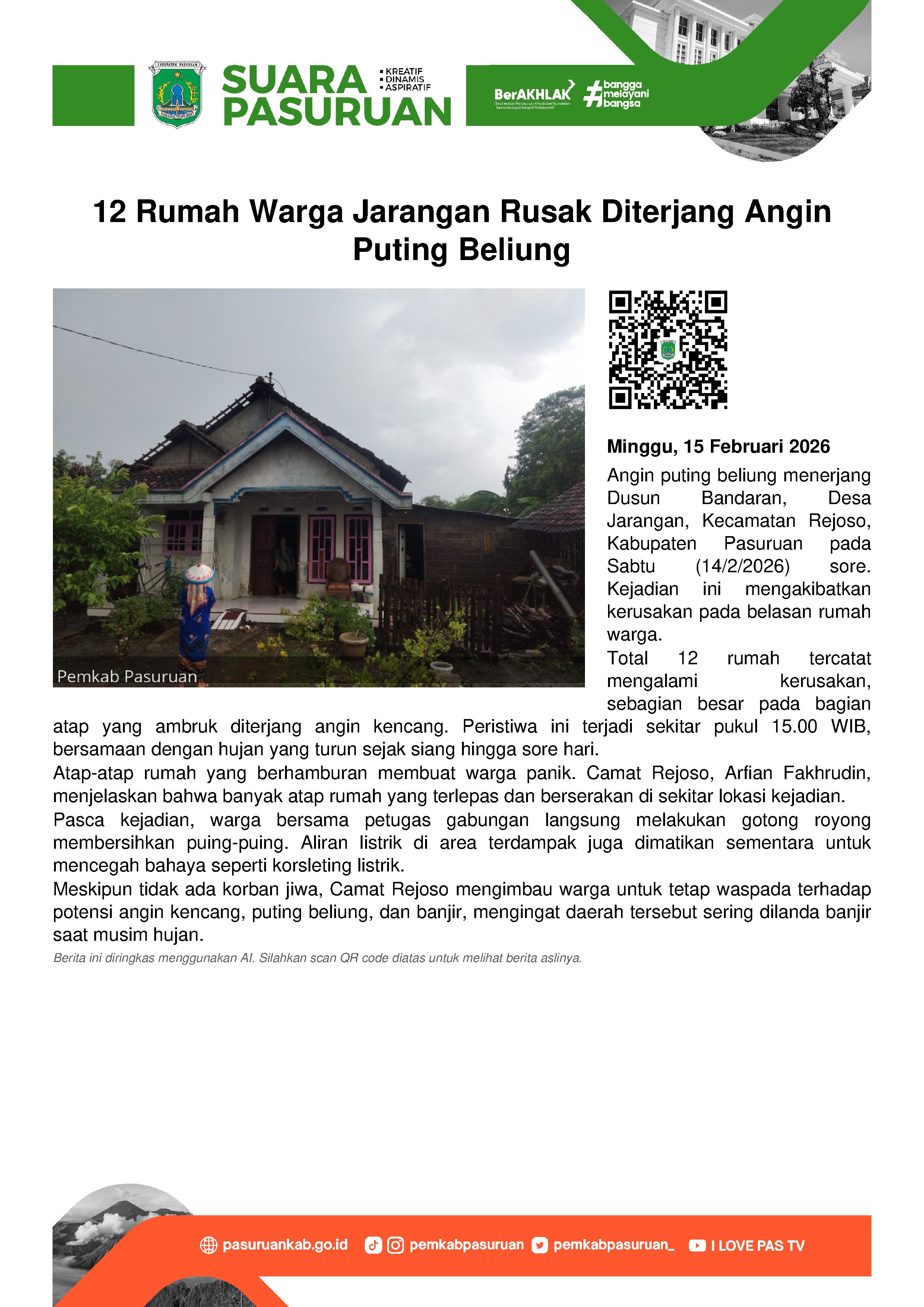 Belasan rumah warga Dusun Bandaran, Desa Jarangan, Kecamatan Rejoso, Kabupaten Pasuruan mengalami kerusakan akibat angin puting beliung, Sabtu (14/2/2026).