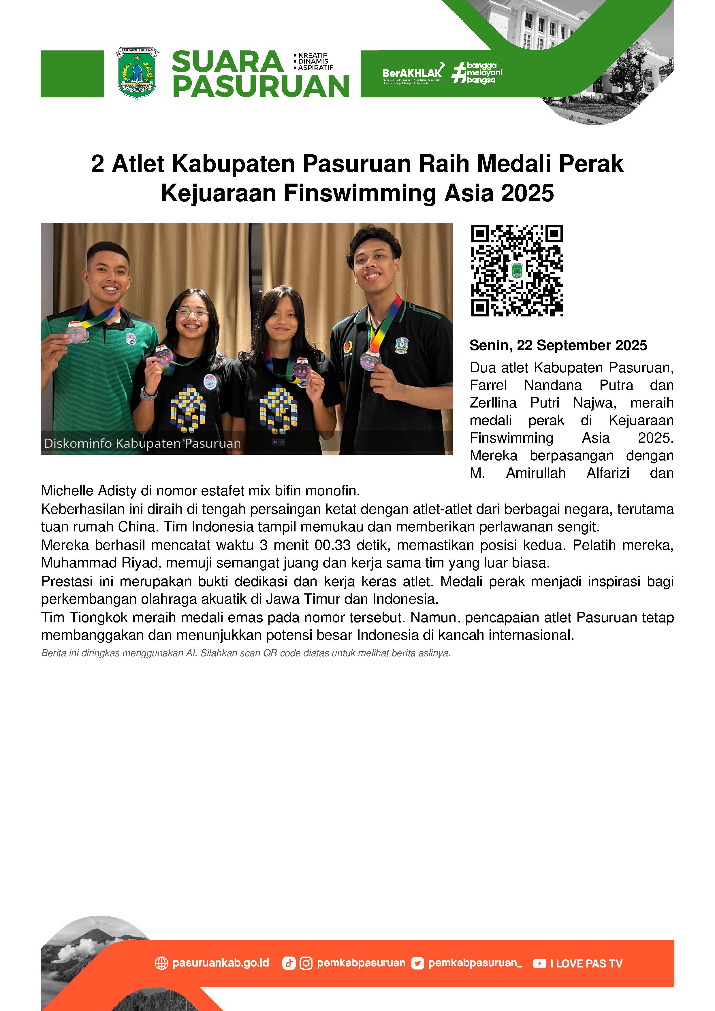 Dua atlet Kabupaten Pasuruan berhasil menjadi Jawara dalam Kejuaraan Finswimming Asia 2025 di China, 19-21 september kemarin.