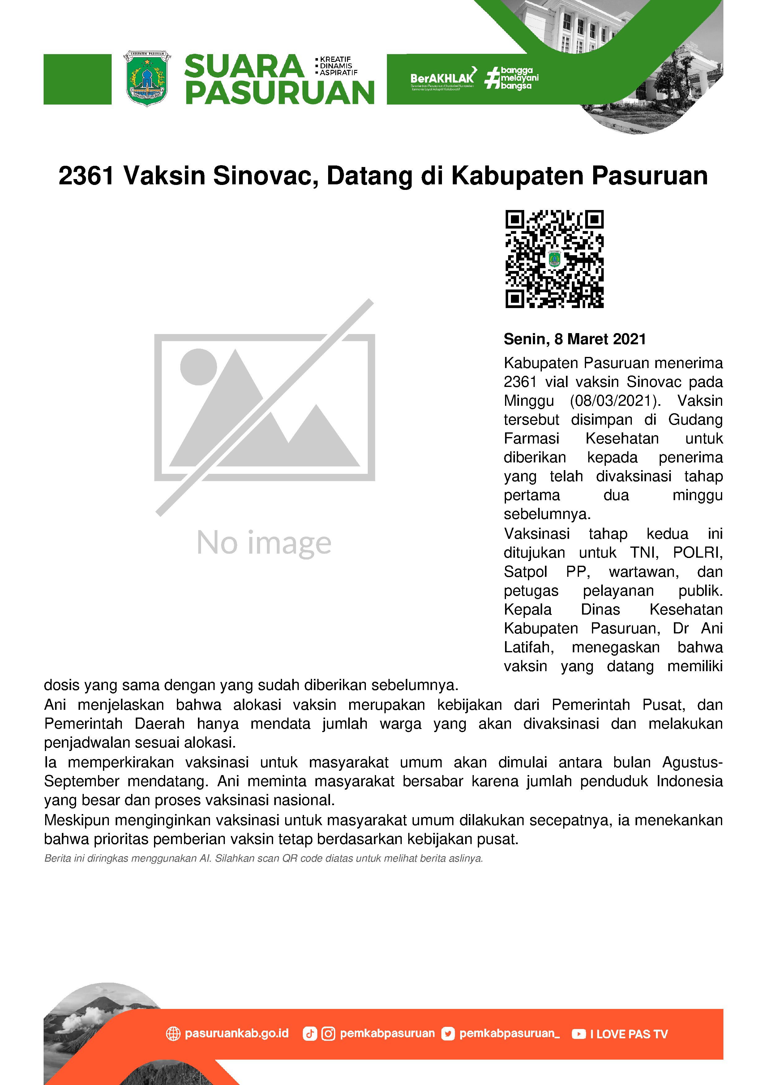 Kepala Dinas Kesehatan Kabupaten Pasuruan, Dr Ani Latifah mengatakan, 2361 vaksin yang datang dialokasikan untuk TNI, POLRI, Satpol PP, Wartawan hingga petugas pelayanan public yang sebelumnya sudah melakukan vaksin, dua minggu lalu.