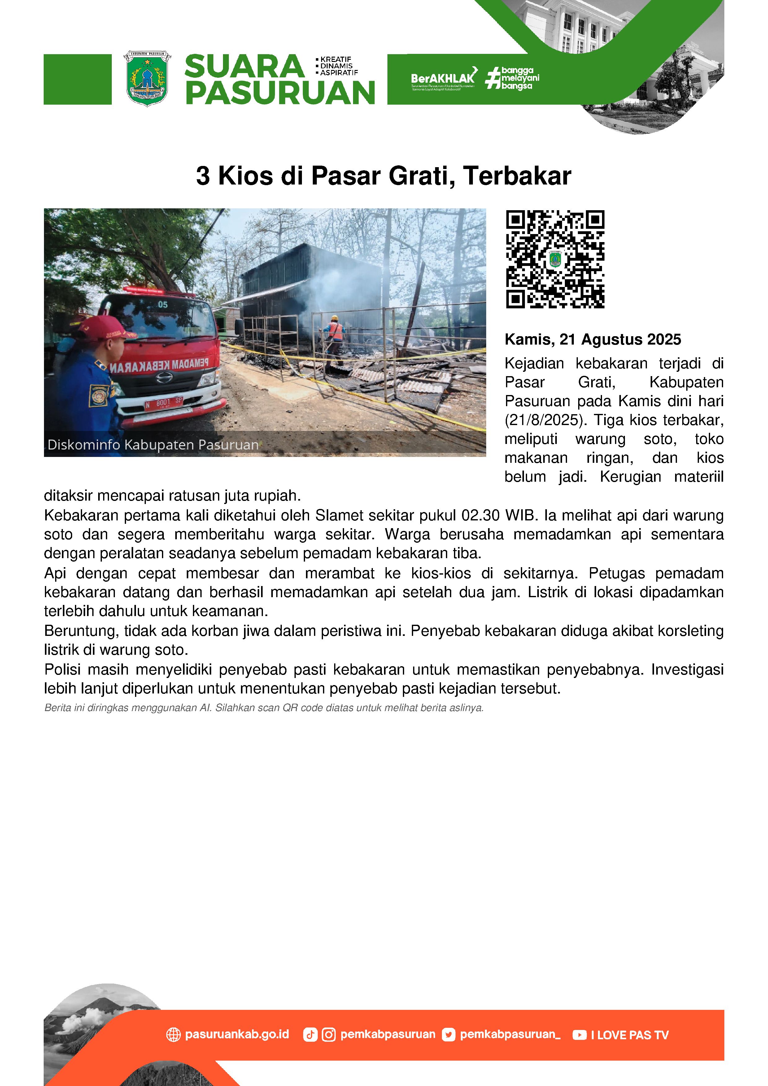 Beruntung, tidak ada korban jiwa dalam kejadian kebakaran di Pasar Grati. Namun, kerugian materiil ditaksir mencapai ratusan juta rupiah. Perihal penyebab kebakaran, diduga akibat korsleting listrik dari warung soto. Namun untuk kepastiannya, hingga kini masih diselidiki. (emil)