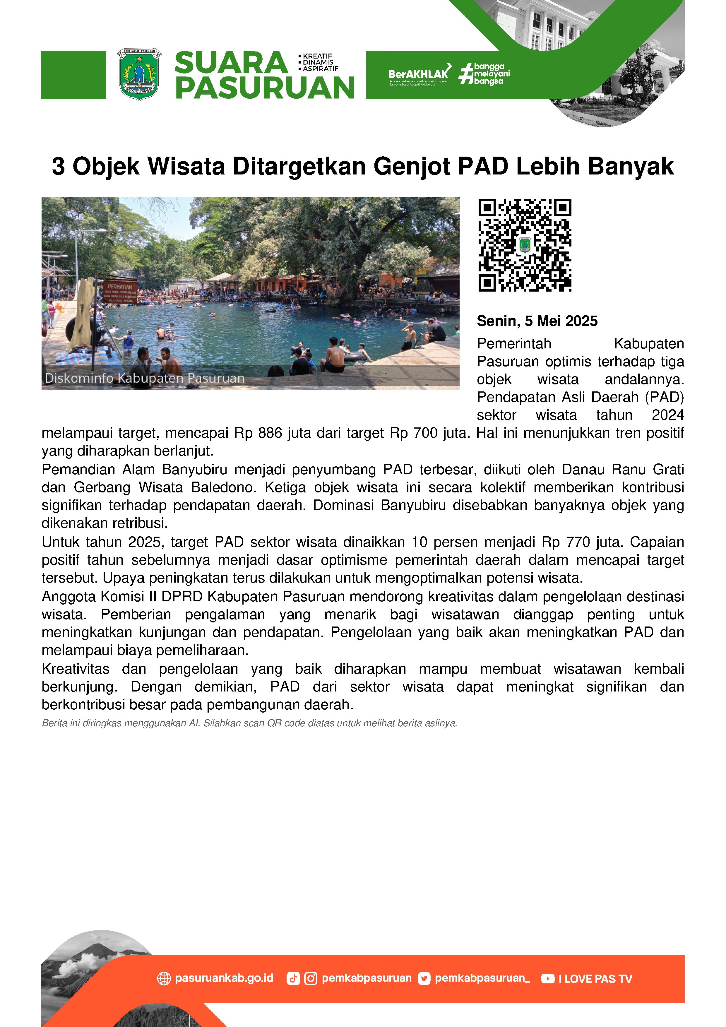 "Alhamdulillah, PAD dari retribusi tiga tempat wisata di tahun kemarin melebihi target. Dari sinilah kami melihat tren positif yang mudah-mudahan akan berlangsung di tahun-tahun mendatang," kata Nusantoro saat ditemui di ruangannya, Senin (5/5/2025).