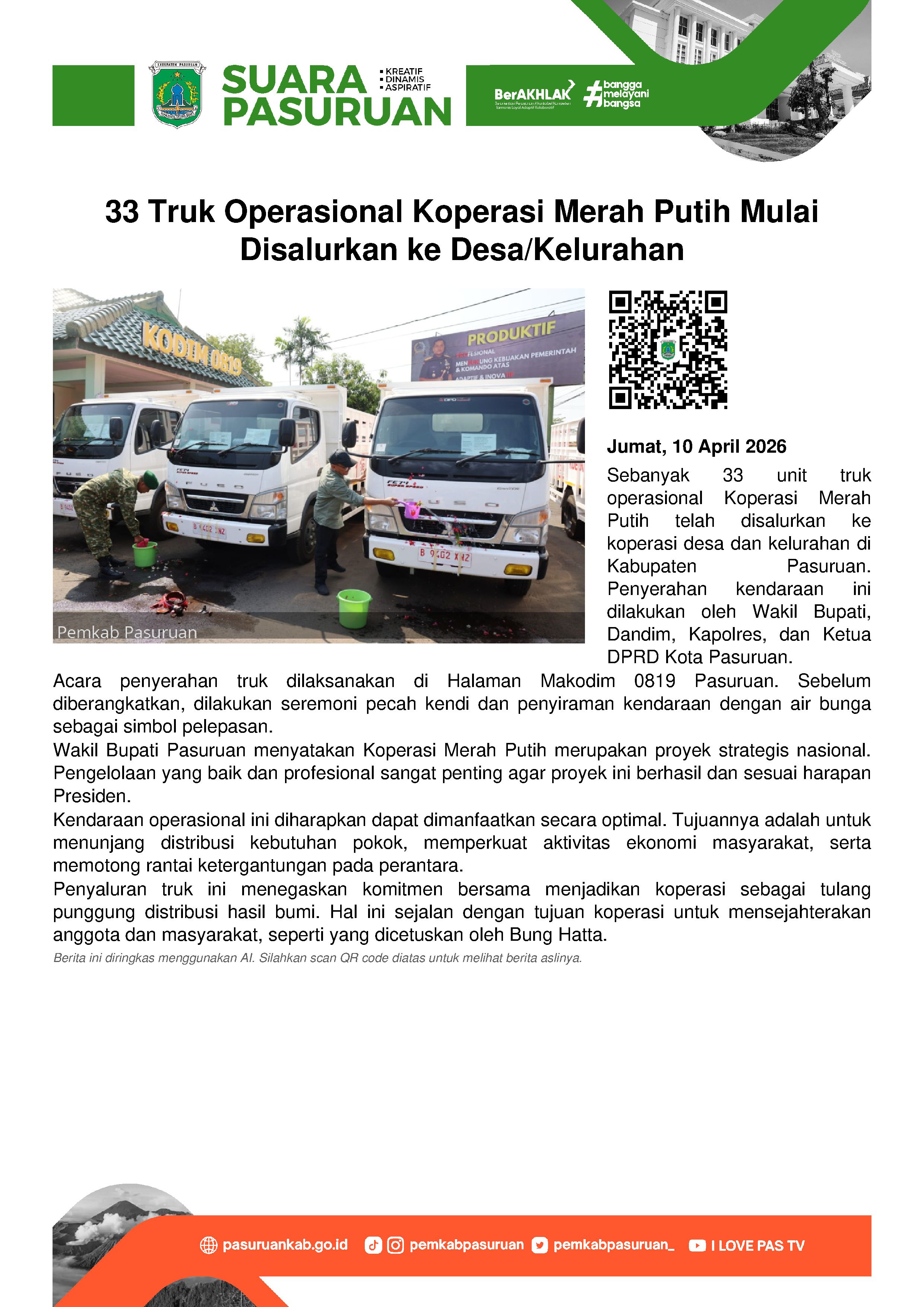 Sebagai buktinya, sebanyak 33 unit truk koperasi merah putih secara resmi diserahkan dan disalurkan kepada koperasi desa dan kelurahan yang tersebar di seluruh wilayah Kabupaten Pasuruan.