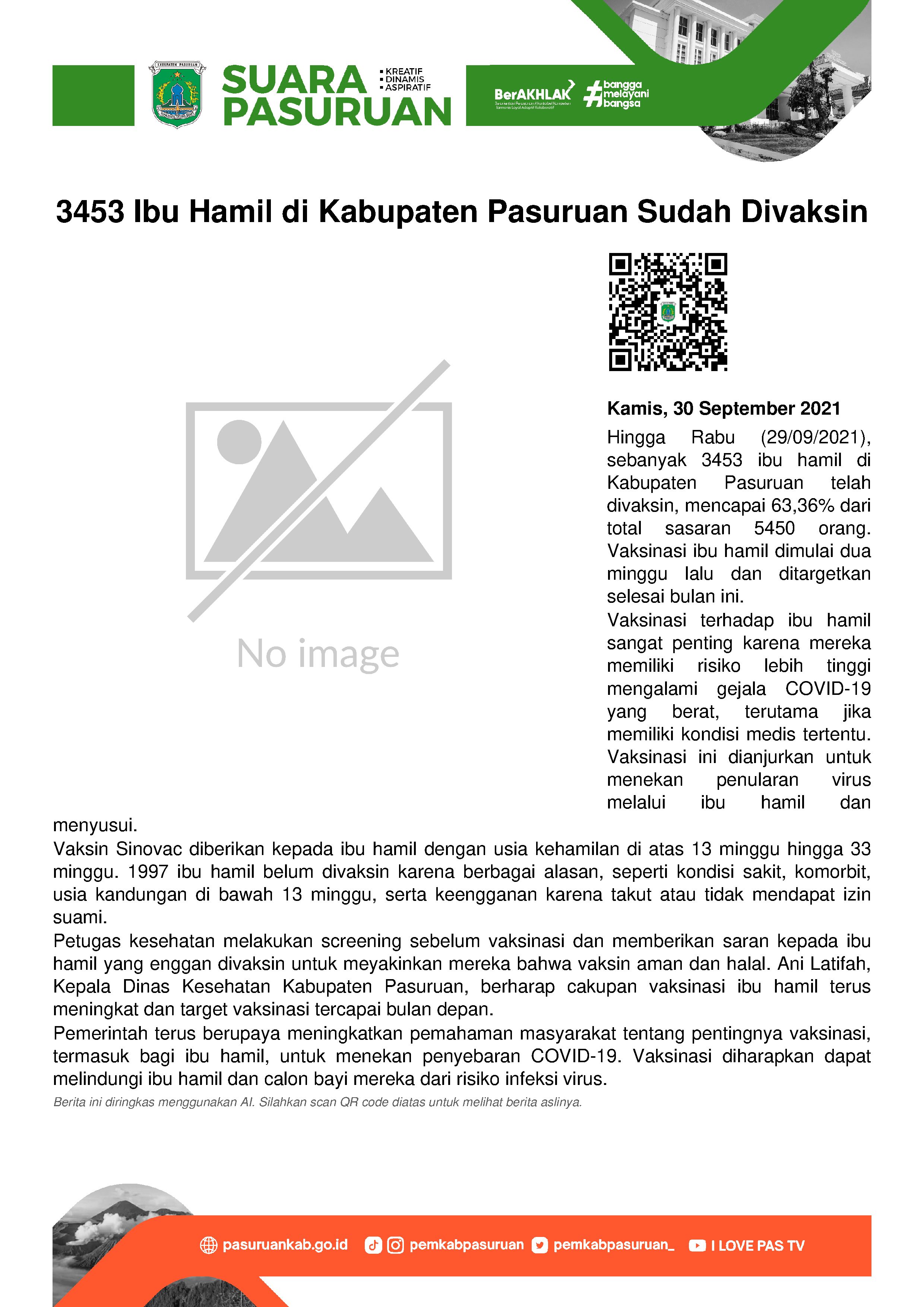 Hingga Rabu (29/09/2021) kemarin, jumlah ibu hamil (bumil) di Kabupaten Pasuruan yang sudah divaksin mencapai 3453 orang.