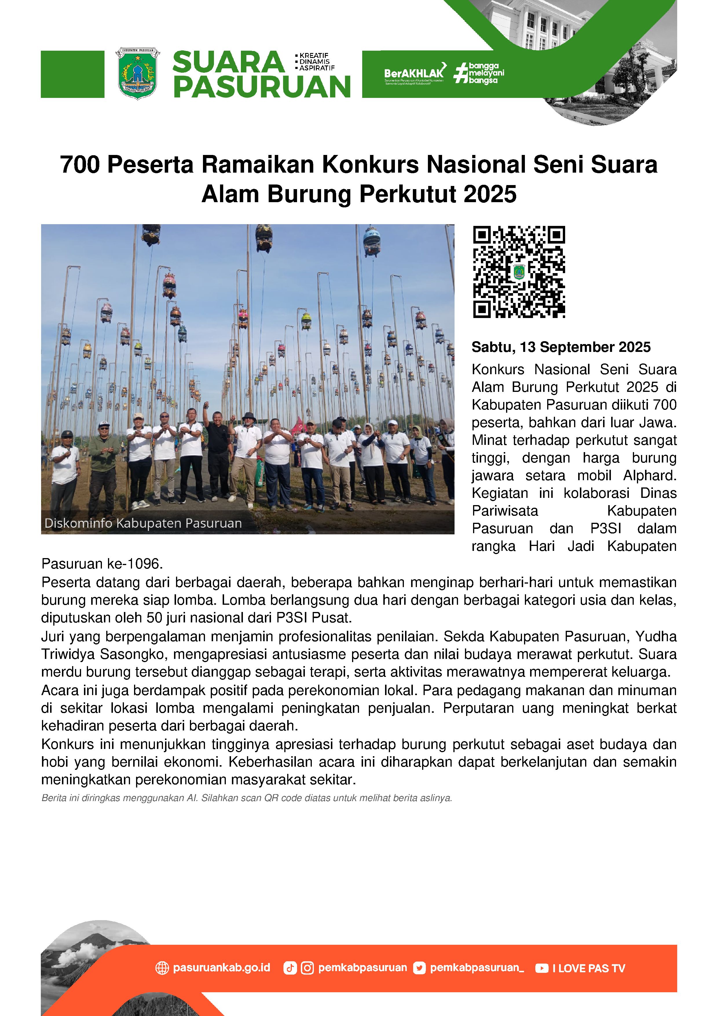 Event yang digelar oleh Dinas Pariwisata Kabupaten Pasuruan berkolaborasi dengan Persatuan Pelestari Perkutut Seluruh Indonesia (P3SI) dalam rangka Hari Jadi Kabupaten Pasuruan ke 1096 ini diikuti tak kurang dari 700 pecinta burung perkutut.