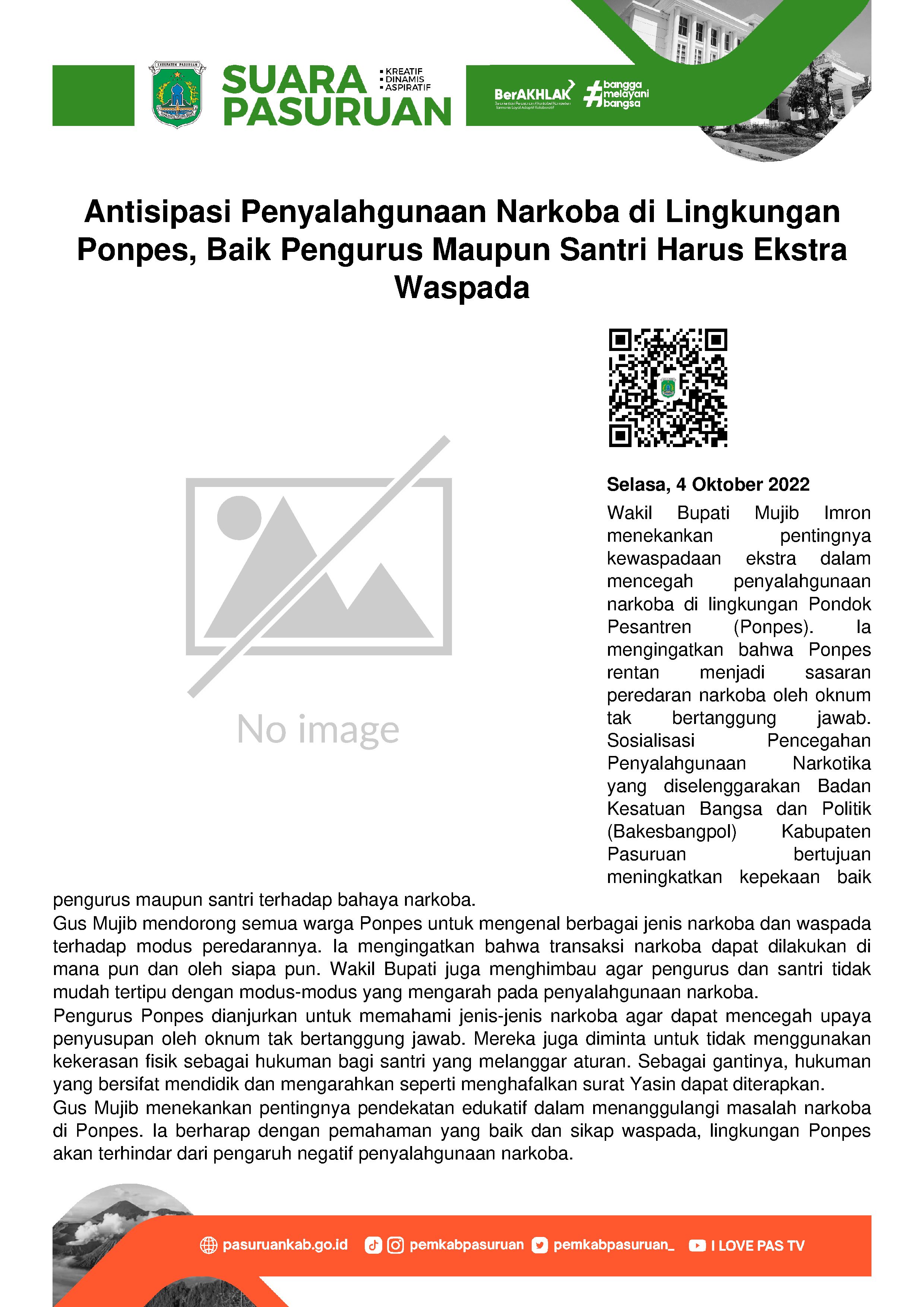 Dalam agenda Sosialisasi Pencegahan Penyalahgunaan Narkotika yang dilaksanakan Badan Kesatuan Bangsa dan Politik (Bakesbangpol) Kabupaten Pasuruan pada hari ini, Selasa (4/10/2022), Gus Mujib menitikberatkan kepada kepekaan yang wajib dimiliki oleh seluruh warga Ponpes. Sehingga secara bersama-sama dapat membentengi diri terhadap potensi beragam bentuk penyalahgunaan bahaya narkoba.