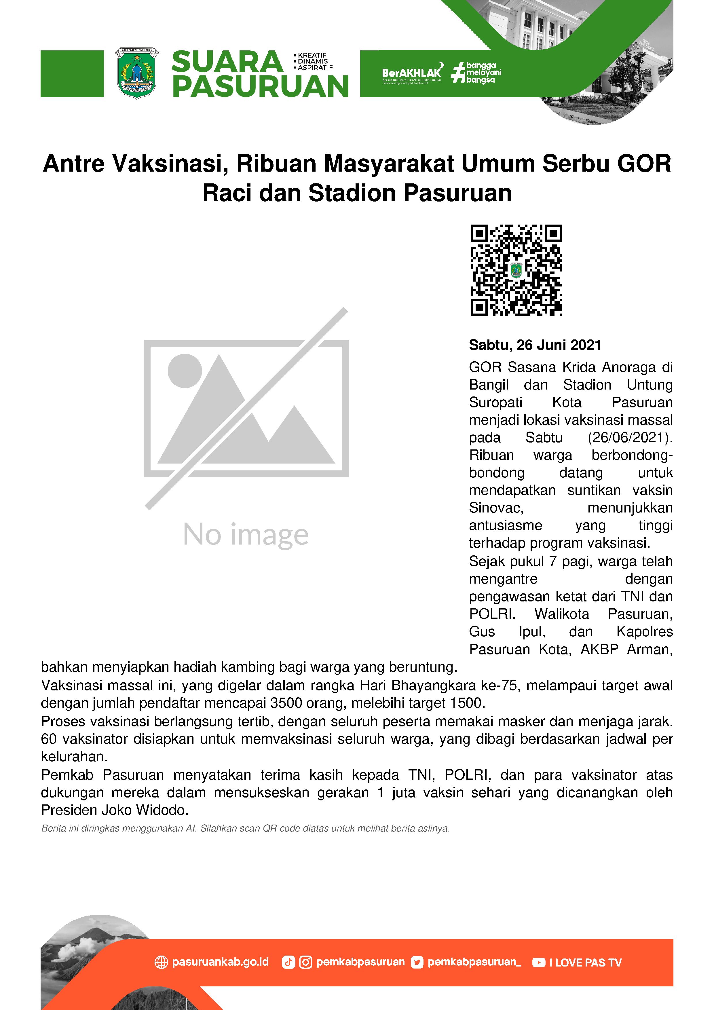 GOR Sasana Krida Anoraga di Bangil dan Stadion Untung Suropati Kota Pasuruan disulap menjadi lokasi Vaksinasi Massal, Sabtu (26/06/2021) pagi.