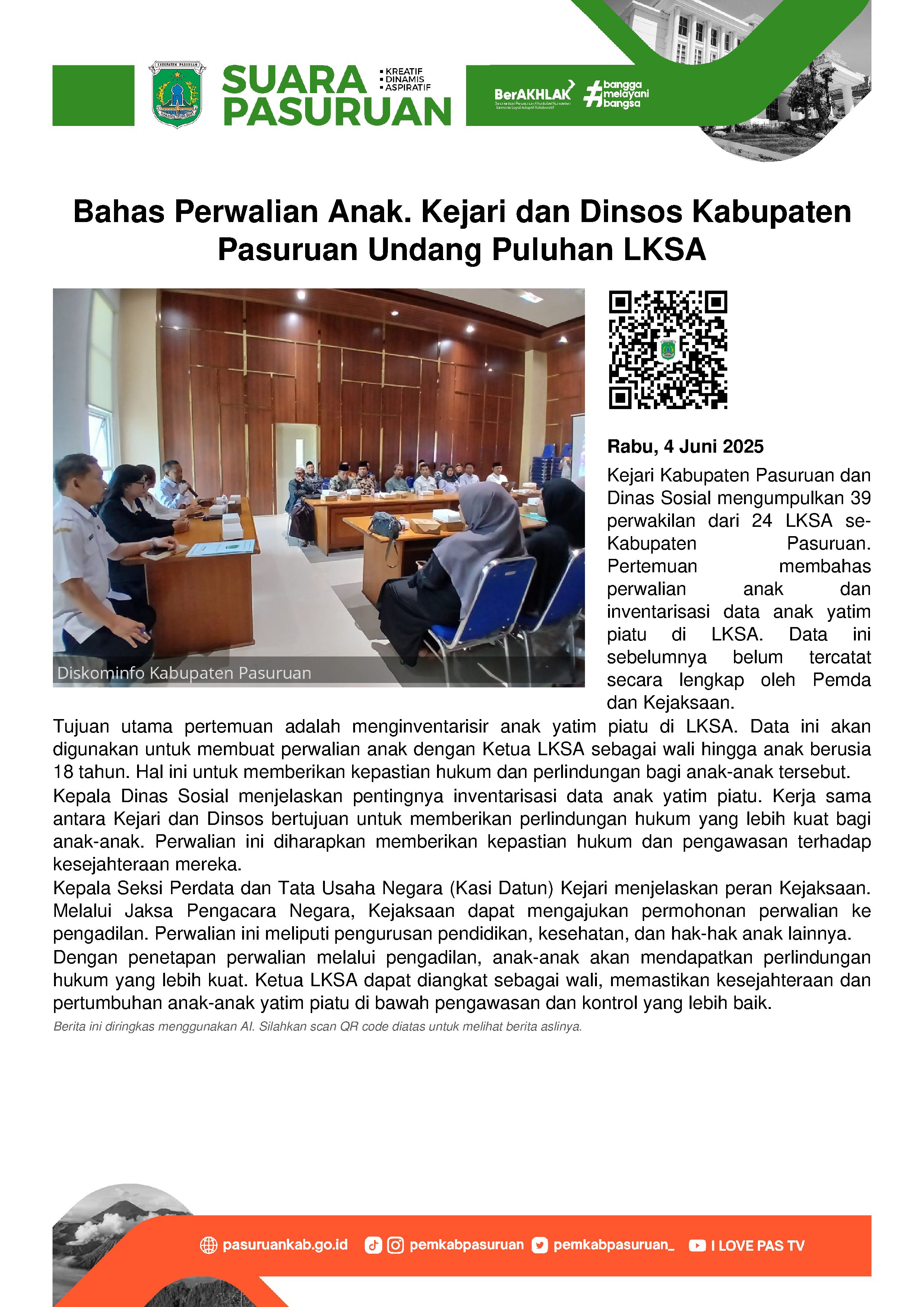 "Sebenarnya ini program Kejaksaan Negeri, yakni Kasi Datun berkoordinasi dengan Dinas Sosial Kabupaten Pasuruan tentang perwalian anak. Selama ini memang belum pernah menginventarisir data anak yatim piatu di LKSA, dan dengan pertemuan ini kami langsungi inventarisir," ucapnya.