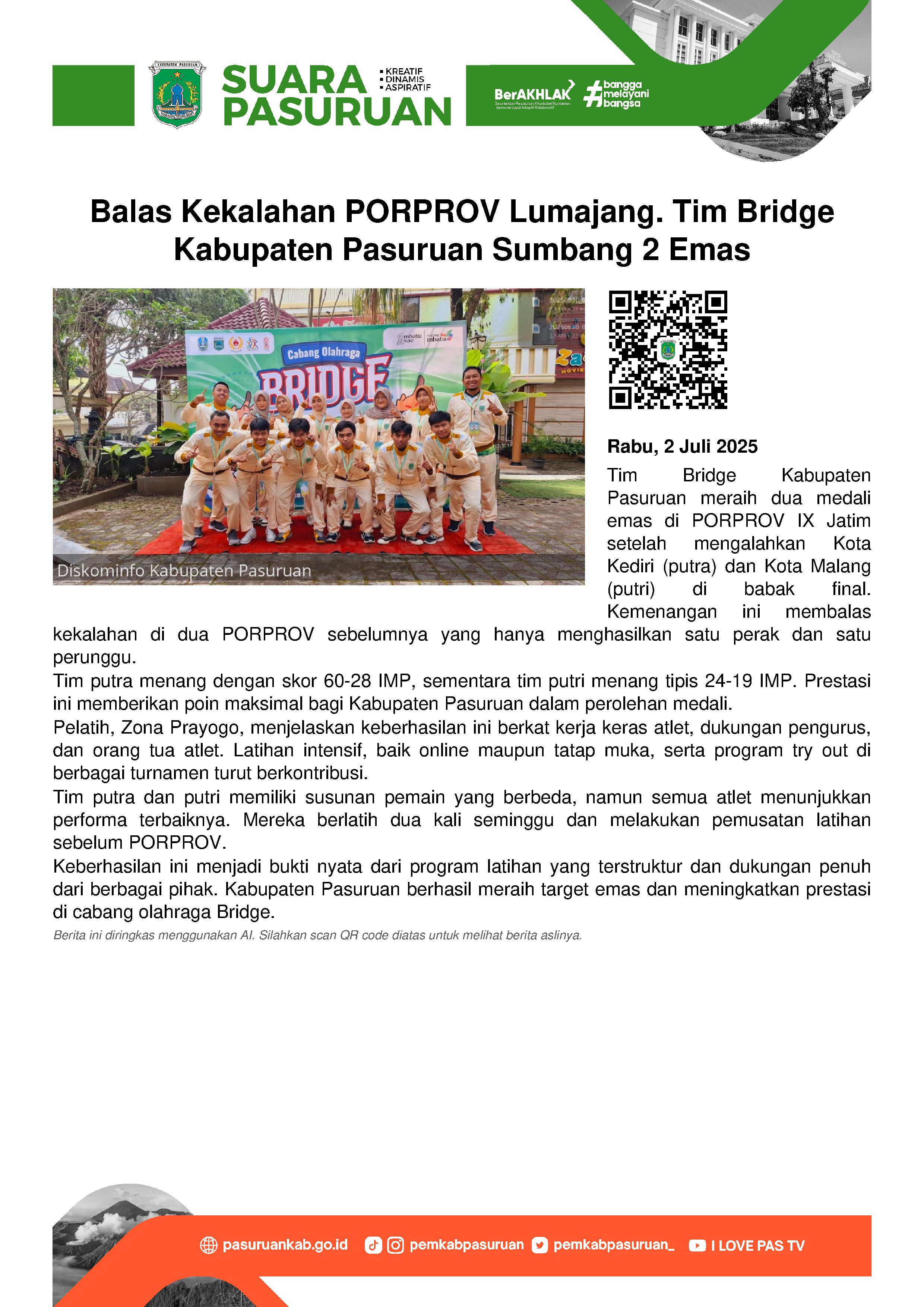 Membalas kekalahan pada PORPROV di tahun-tahun sebelumnya, Tim Bridge Kabupaten Pasuruan kini berhasil tampil gemilang pada PORPROV IX Jatim.