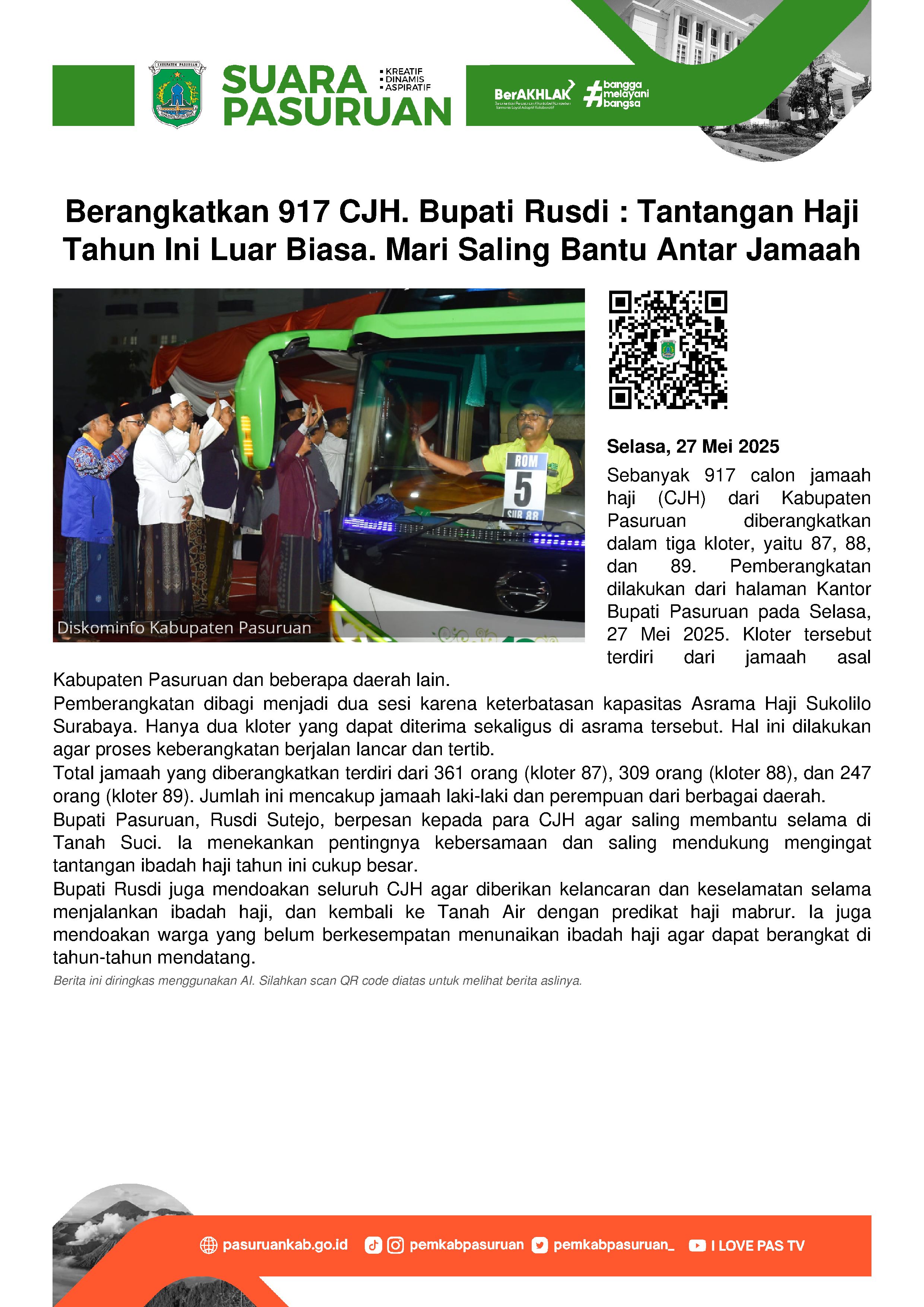 Para tamu Allah itu diberangkatkan oleh Bupati Pasuruan, Rusdi Sutejo, dari Halaman Kantor Bupati Pasuruan, Selasa (27/5/2025) pagi.