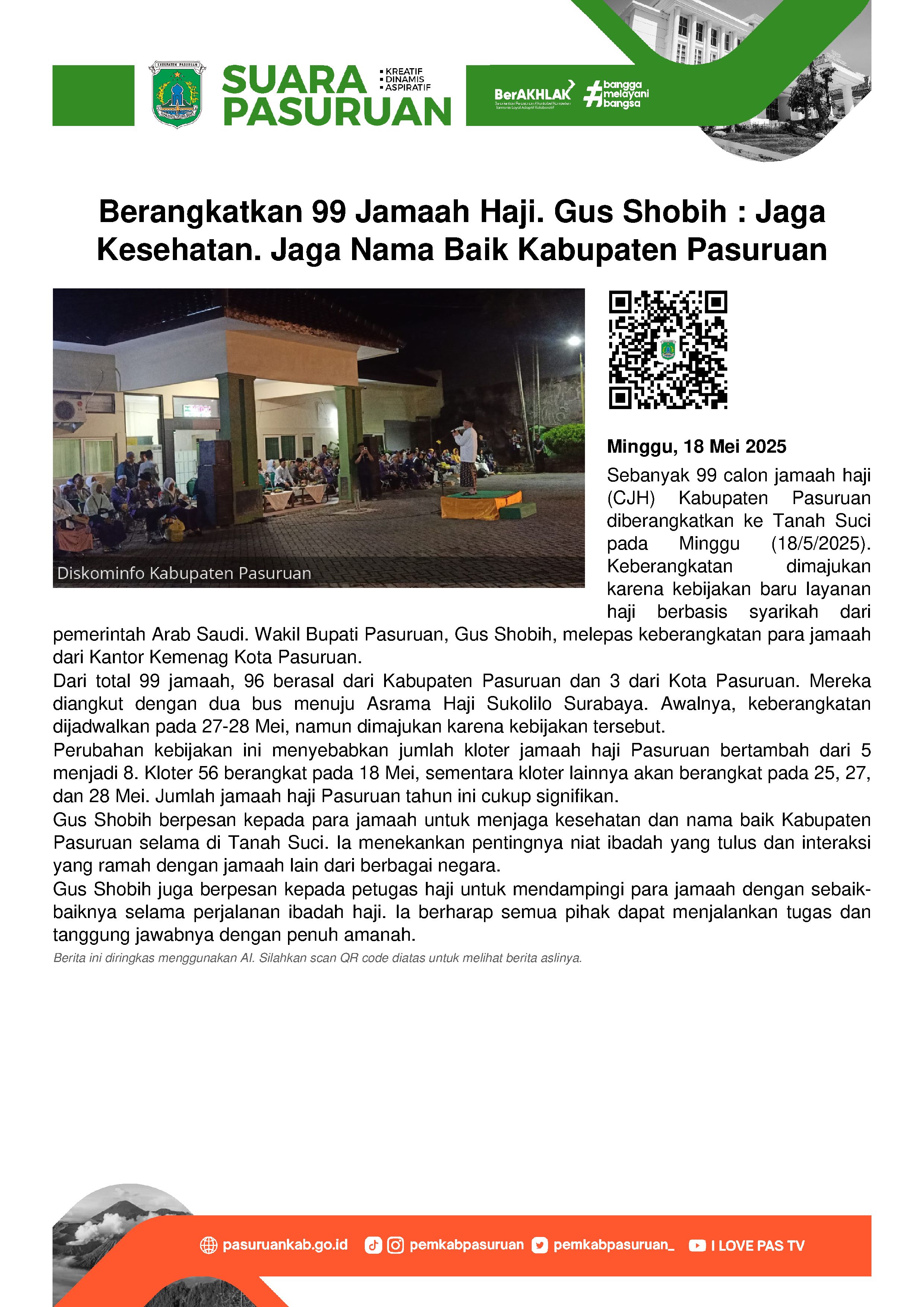 "Jaga nama baik Kabupaten Pasuruan. Jadilah jamaah yang ramah kepada siapapun. Karena semua umat islam di dunia berkumpul jadi satu di Makkah dan Madinah," terangnya.