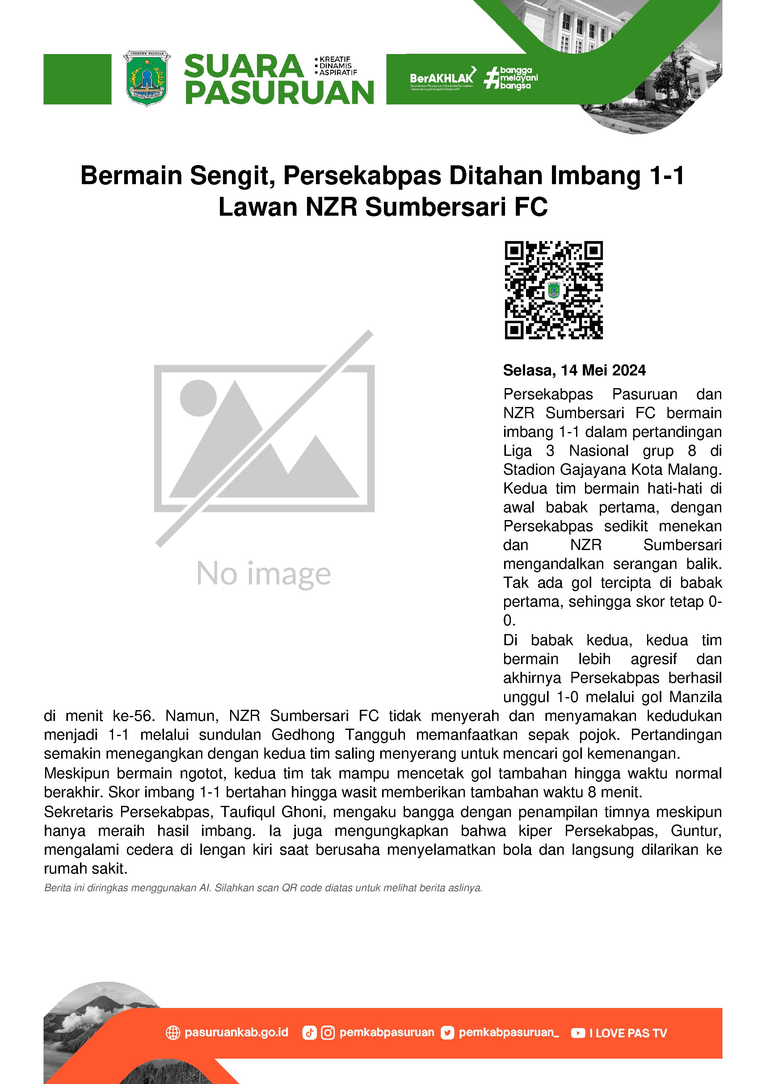 Dalam lanjutan kompetisi Liga 3 Nasional grup 8 yang gelar di Stadion Gajayana Kota Malang pada Selasa (14/5/2024), Persekabpas Pasuruan harus puas dengan bermain imbang 1-1 saat menghadapi NZR Sumbersari FC.