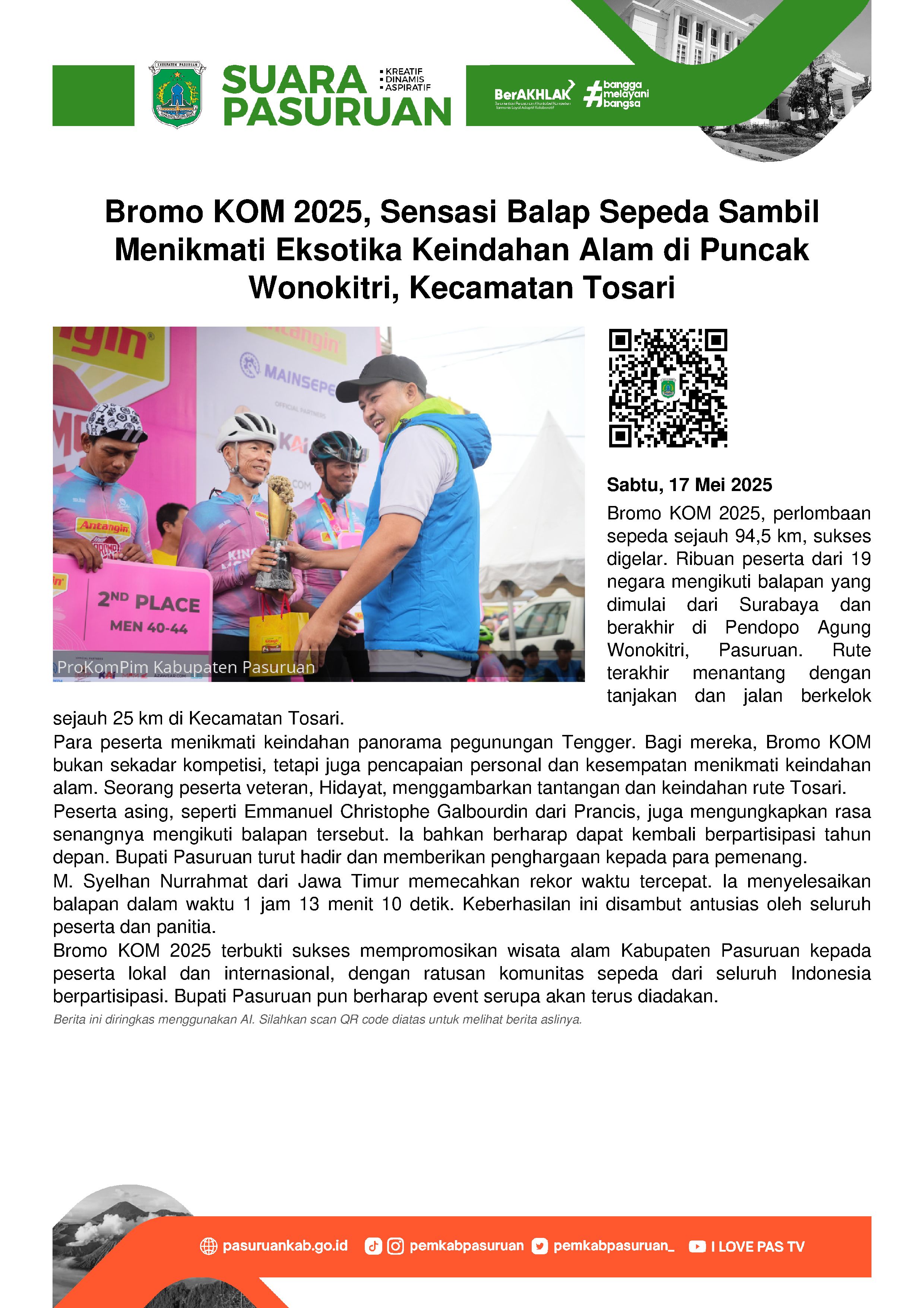 ke depannya Pemkab Pasuruan bisa menggelar lomba sepeda di Tosari. Atau bisa
