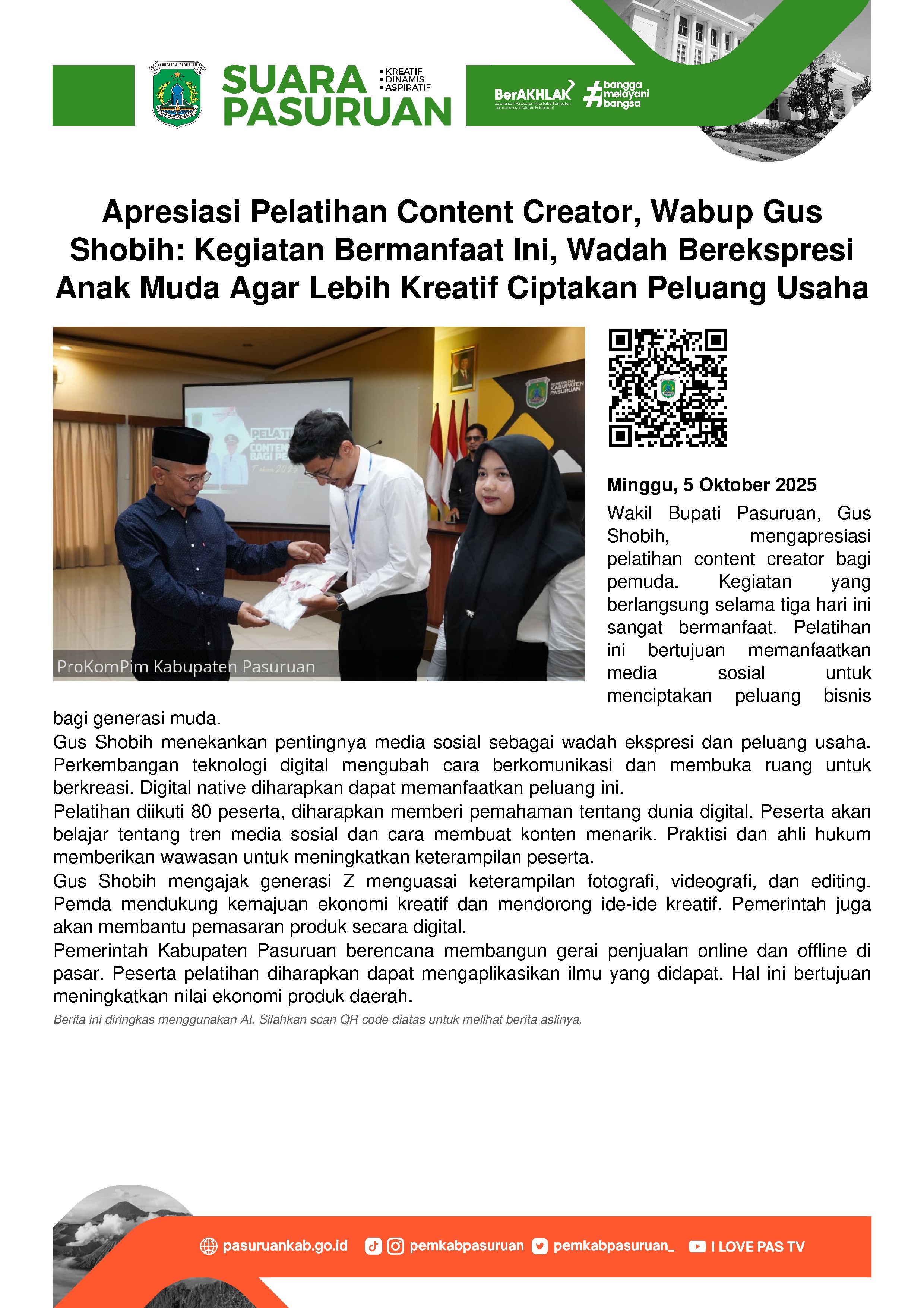 Wakil Bupati Pasuruan, Shobih Asrori mengapresiasi Pelatihan Content Creator Bagi Pemuda Tahun 2025 yang digelar selama tiga hari berturut-turut (3-5 September 2025) di Tanjung Plaza Hotel, Prigen. Menurutnya, kegiatan yang diinisiasi oleh Dinas Pemuda dan Olahraga (Dispora) tersebut sangat bermanfaat bagi seluruh peserta. Terutama dalam memanfaatkan media sosial sebagai ruang kreatif untuk menciptakan peluang bisnis.