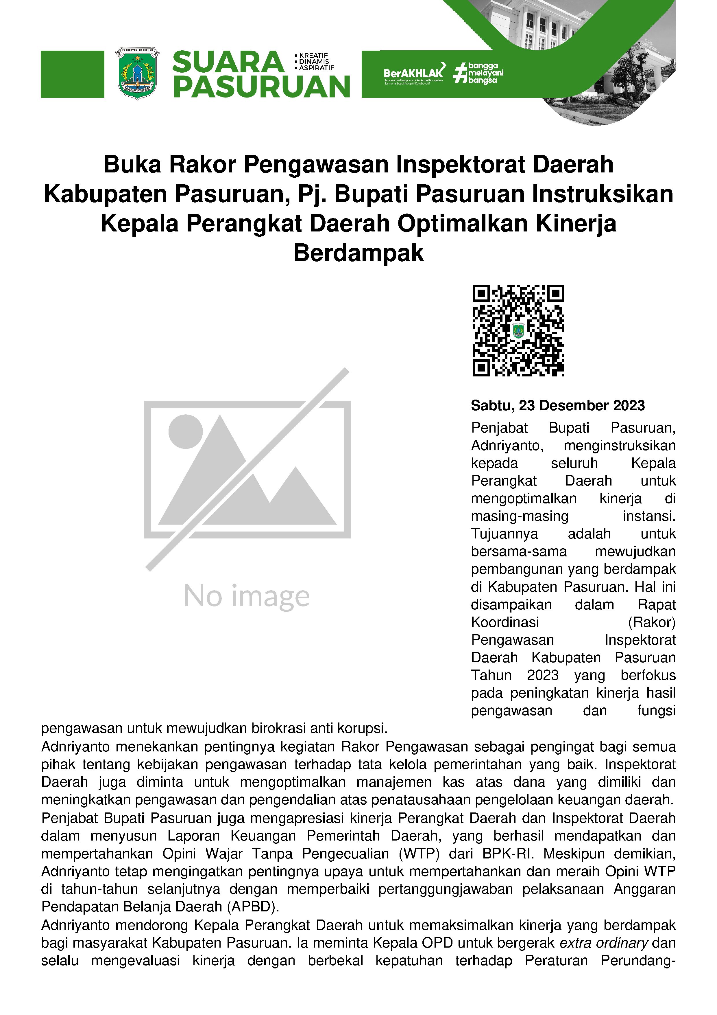 Di penghujung tahun 2023, Penjabat (Pj.) Bupati Pasuruan, Adnriyanto kembali meminta kepada seluruh Kepala Peragkat Daerah agar benar-benar mengoptimalkan kinerja di masing-masing instansi. Targetnya, bersama-sama mewujudkan pembangunan yang berdampak di Kabupaten Pasuruan.