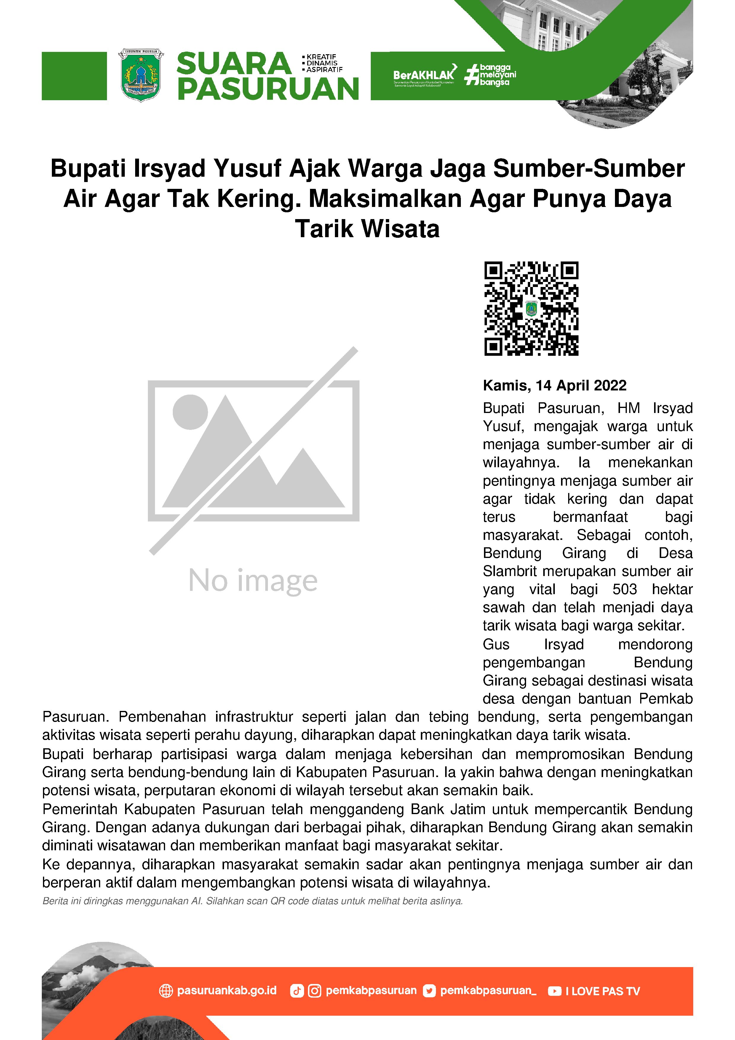 Bupati Pasuruan, HM Irsyad Yusuf (Gus Irsyad) mengajak masyarakat untuk menjaga sumber-sumber air yang sudah ada agar tidak hilang.