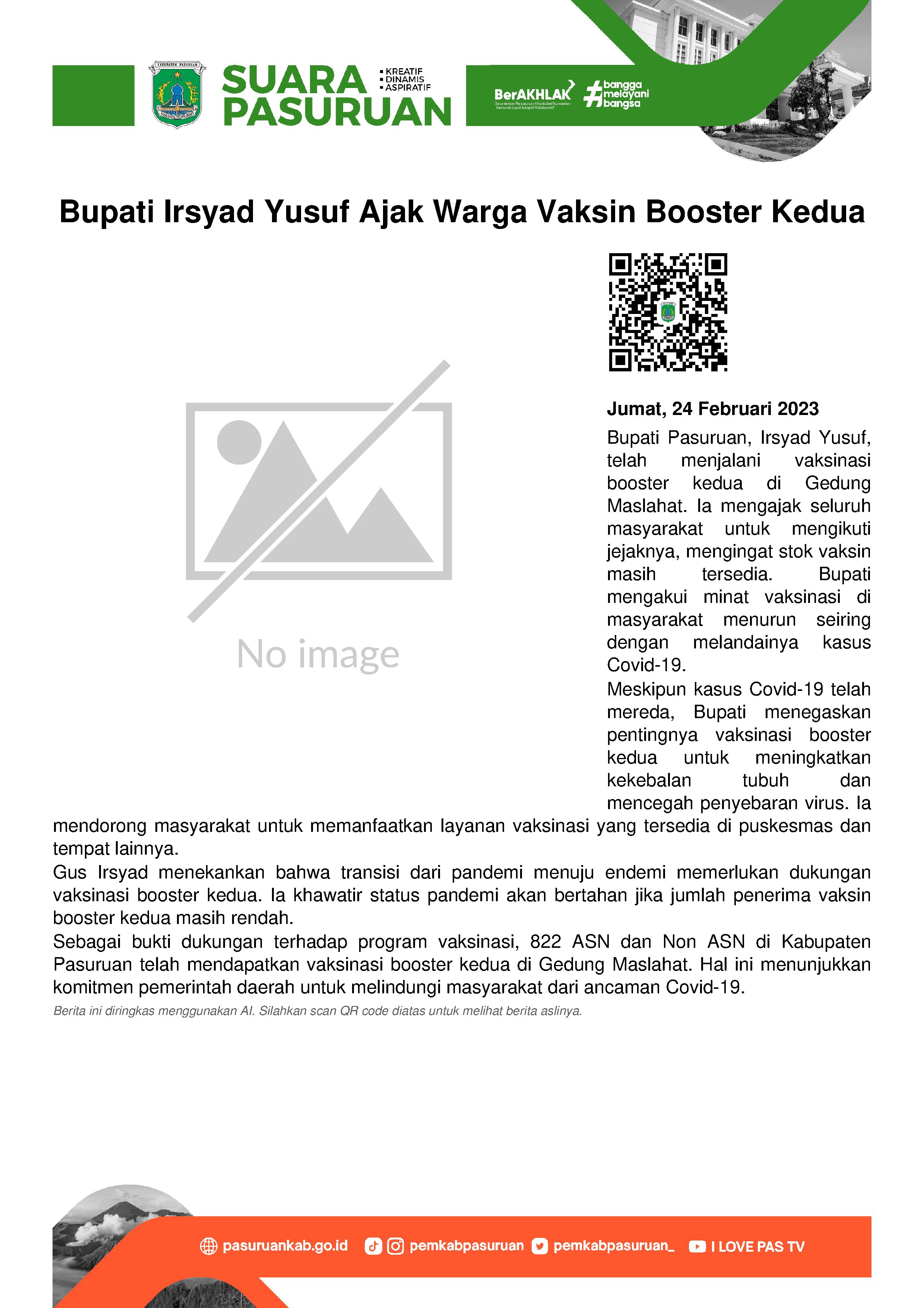 Oleh karena itu, Gus Irsyad-sapaan akrab Bupati Pasuruan ini mengajak seluruh masyarakat yang ada di Kabupaten Pasuruan yang sudah memenuhi syarat untuk datang ke tempat-tempat vaksin, seperti puskesmas.