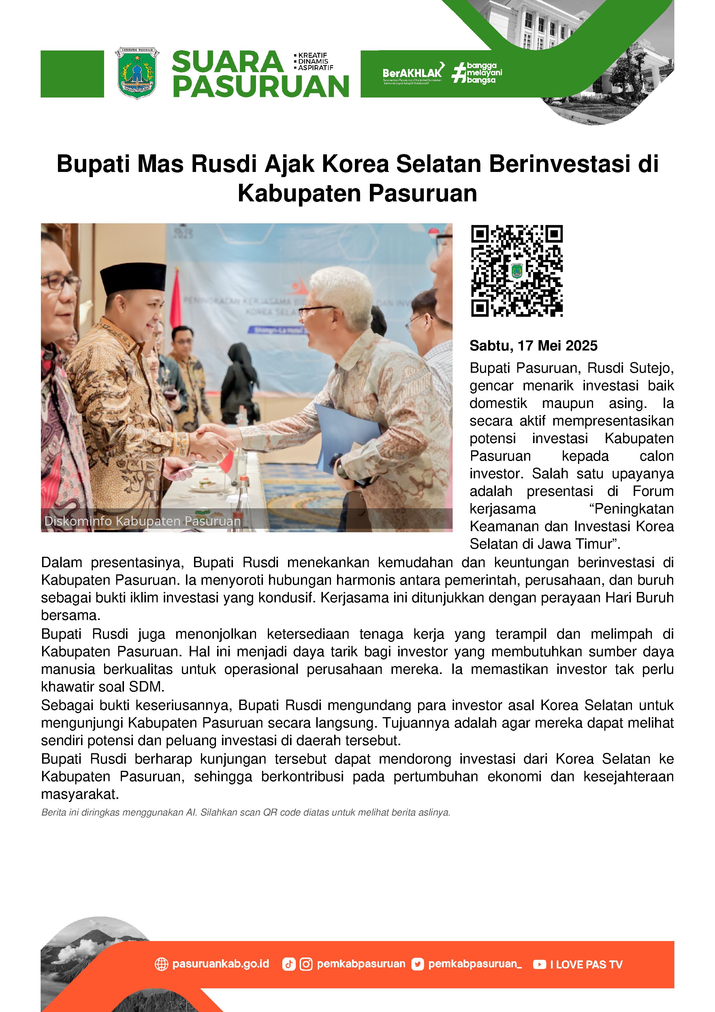 Apa yang dilakukan Mas Rusdi - sapaan akrab Bupati Pasuruan ini bukan omongan belaka. Melainkan langsung mempresentasikan segala potensi dan keunggulan berinvestasi di Kabupaten Pasuruan di depan para investor.