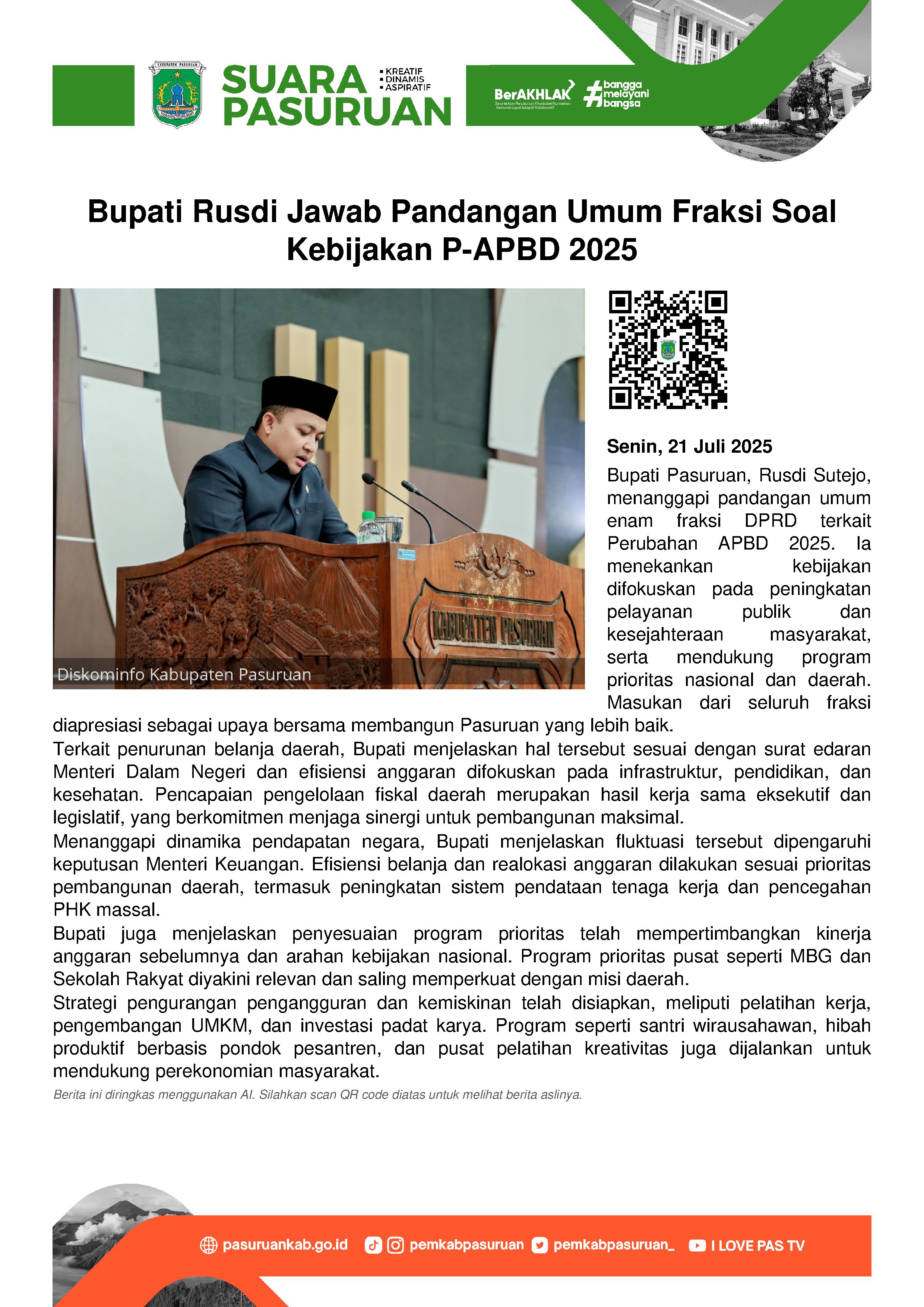 Kali ini, Mas Rusdi - sapaan arabnya hadir untuk memberikan jawaban terhadap pandangan umum enam fraksi DPRD yang sudah disampaikan dalam paripurna sebelumnya. Khususnya pembahasan Perubahan Anggaran Pendapatan dan Belanja Daerah (P-APBD) Tahun 2025.